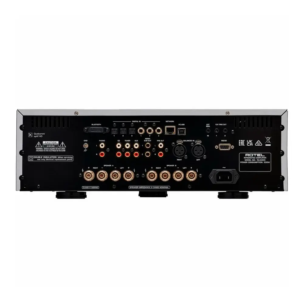 На тыльной панели Rotel RA-6000 присутствует выход Pre Out, набор линейных входов (включая балансный XLR) и вход MM-фонокорректора. Доступно подключение двух сабвуферов через соответствующие RCA-разъемы. Имеется набор цифровых S/PDIF-входов (по три коаксиальных и оптических), асинхронный USB-порт и Ethernet-интерфейс для подключения к локальной сети, что дает возможность управлять усилителем через браузер. Есть интерфейс RS-232, ИК-порт и пара триггерных выходов. Для подсоединения АС служат четыре пары винтовых клемм, с помощью которых можно легко обеспечить двухпроводное подключение. На фронтальной панели корпуса находится 3.5 мм гнездо для наушников и USB-порт, предназначенный для подключения устройств Apple.