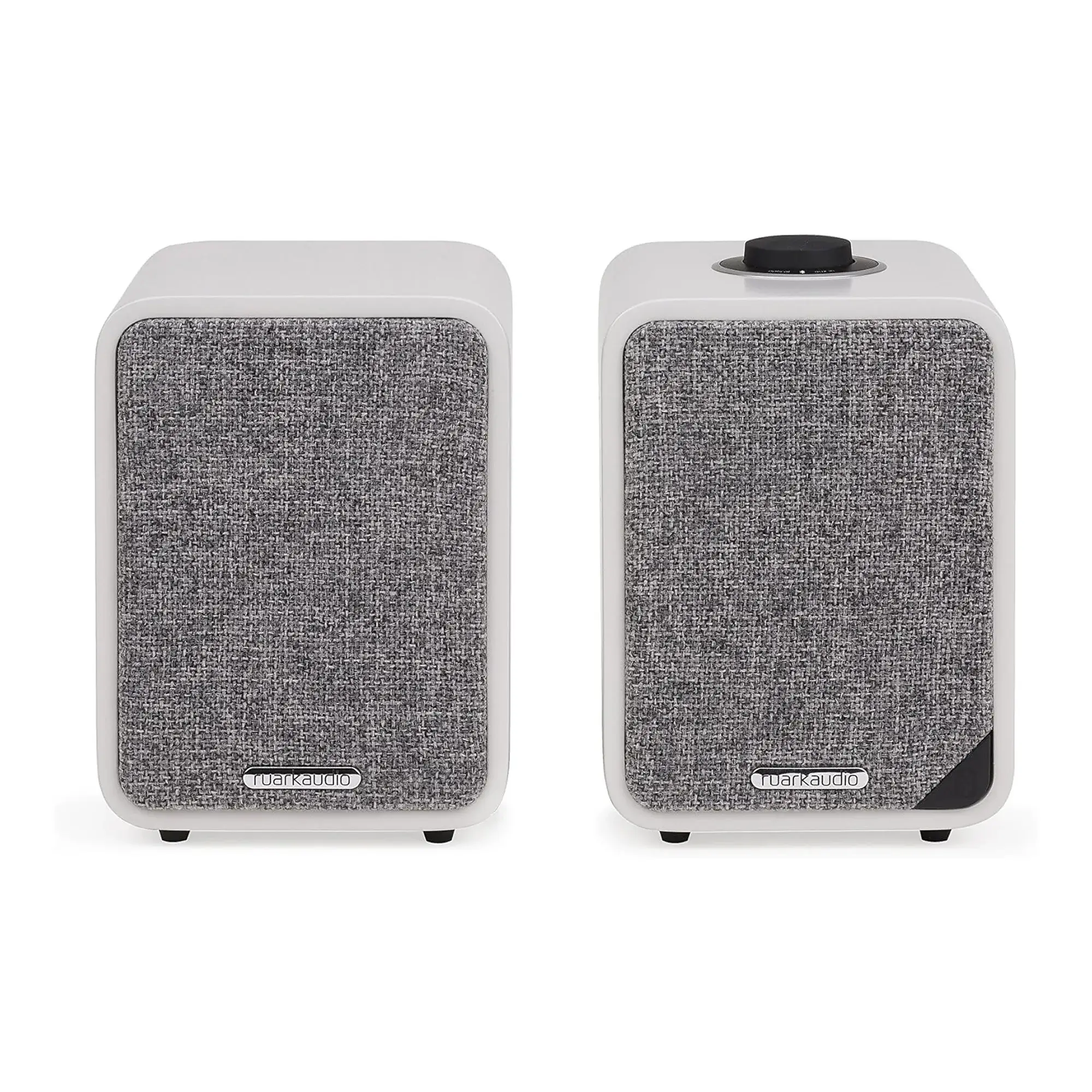 Две колонки из акустической системы Ruark MR1 Mk2 имеют стильный внешний вид и выполнены из качественного дерева. Подключаются они между собой посредством соединительного аудио кабеля, образуя стереопару. Внутри каждой колонки расположен вуфер диаметром 75 мм и твитер на 20 мм. Все динамики обладают магнитным экранированием. Усилитель класса AB расположен в активной колонке, сверху которой имеется регулятор громкости. Входные и выходные порты подключения располагаются на тыльной стороне излучателя.