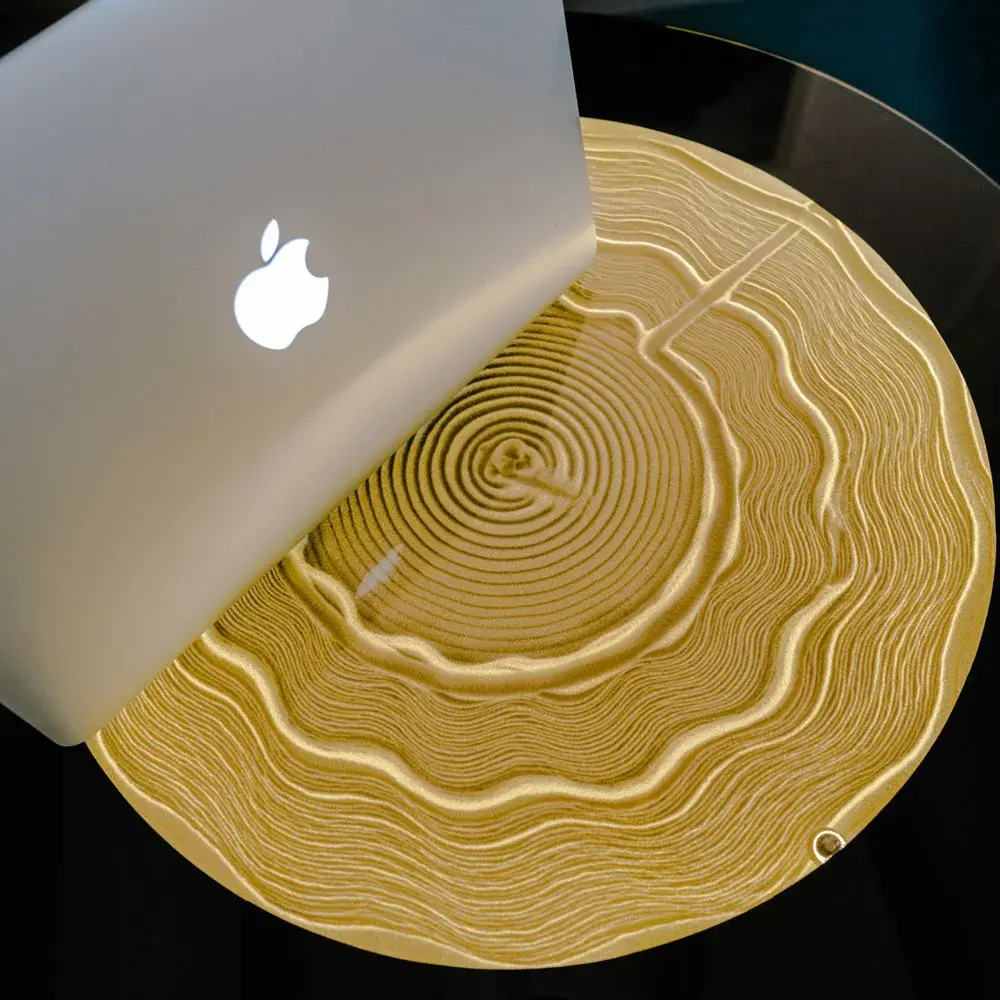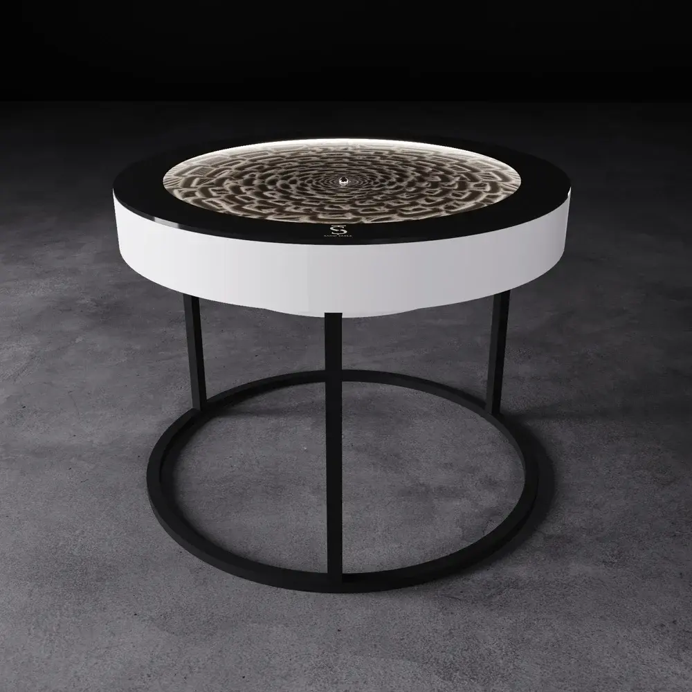 Для любителей острых ощущений, можно выбрать любой цвет подсветки через приложение на iPhone. Стол выдерживает нагрузку до 100 килограмм. Чтобы обеспечить сохранность, столешница накрыта прочным закалённым стеклом Optiwhite, что позволяет в полной мере насладиться движением металлического шара по песку. К столу добавлены модули беспроводной зарядки, чтобы заряжать телефоны, часы, наушники и т.д.