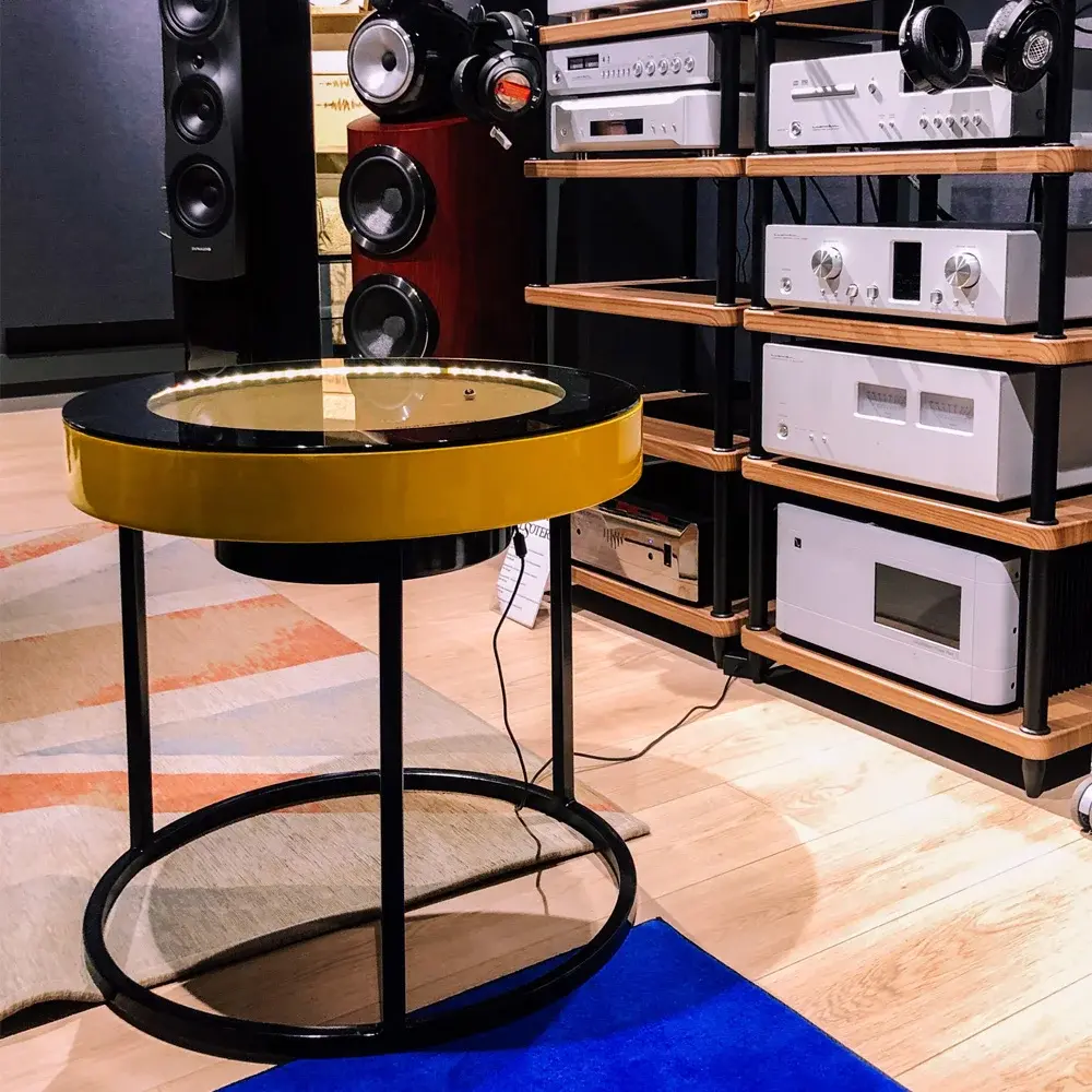 Стильный кофейный стол в ярком цветовом решении, лёгкий и компактный, его вес составляет всего 11 кг. Стол отлично вписался в интерьер акустической комнаты крупнейшего магазина аудиотоваров Dr.Head. Плавные движения шарика, мягкая подсветка и прекрасная музыка позволяют максимально расслабиться и наслаждаться моментом.