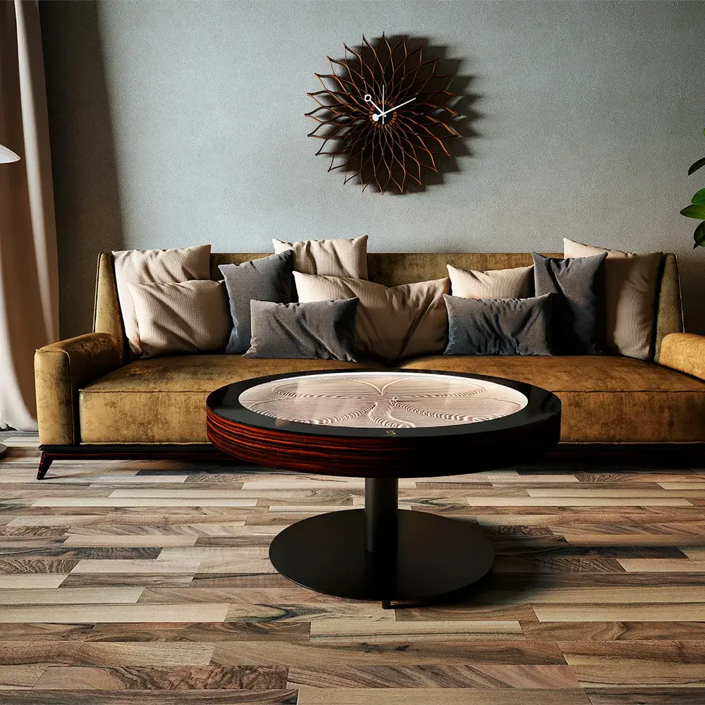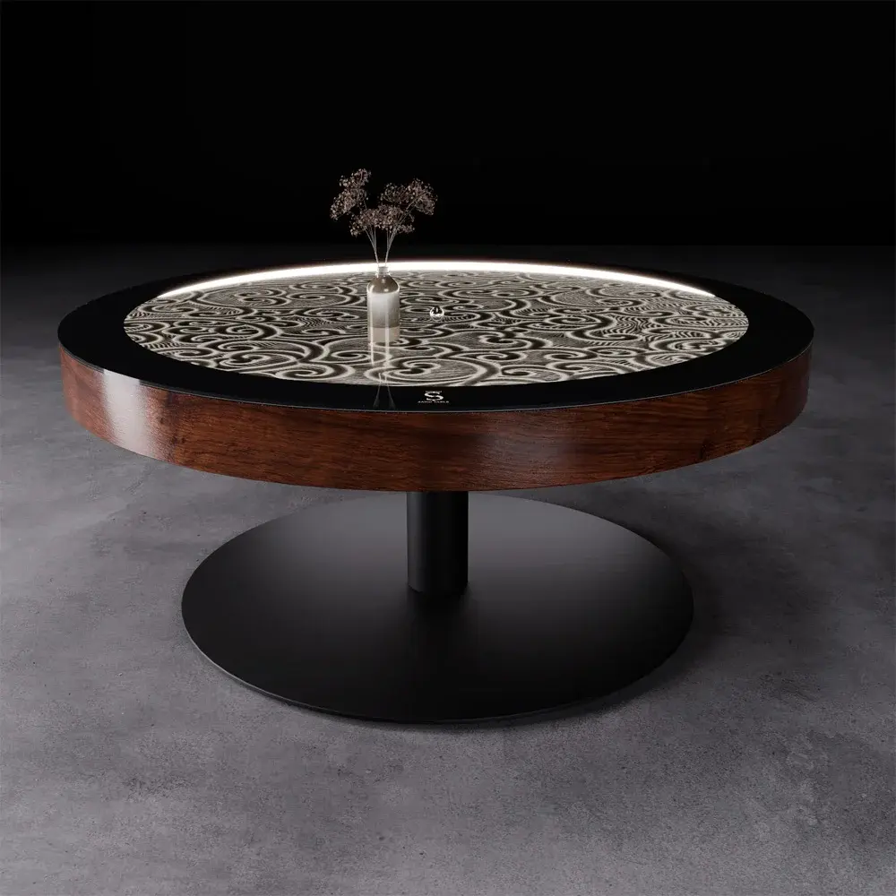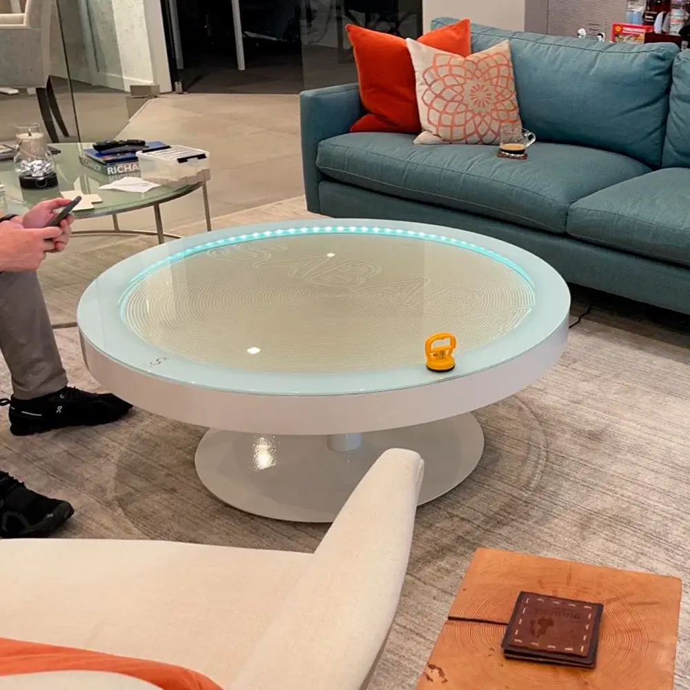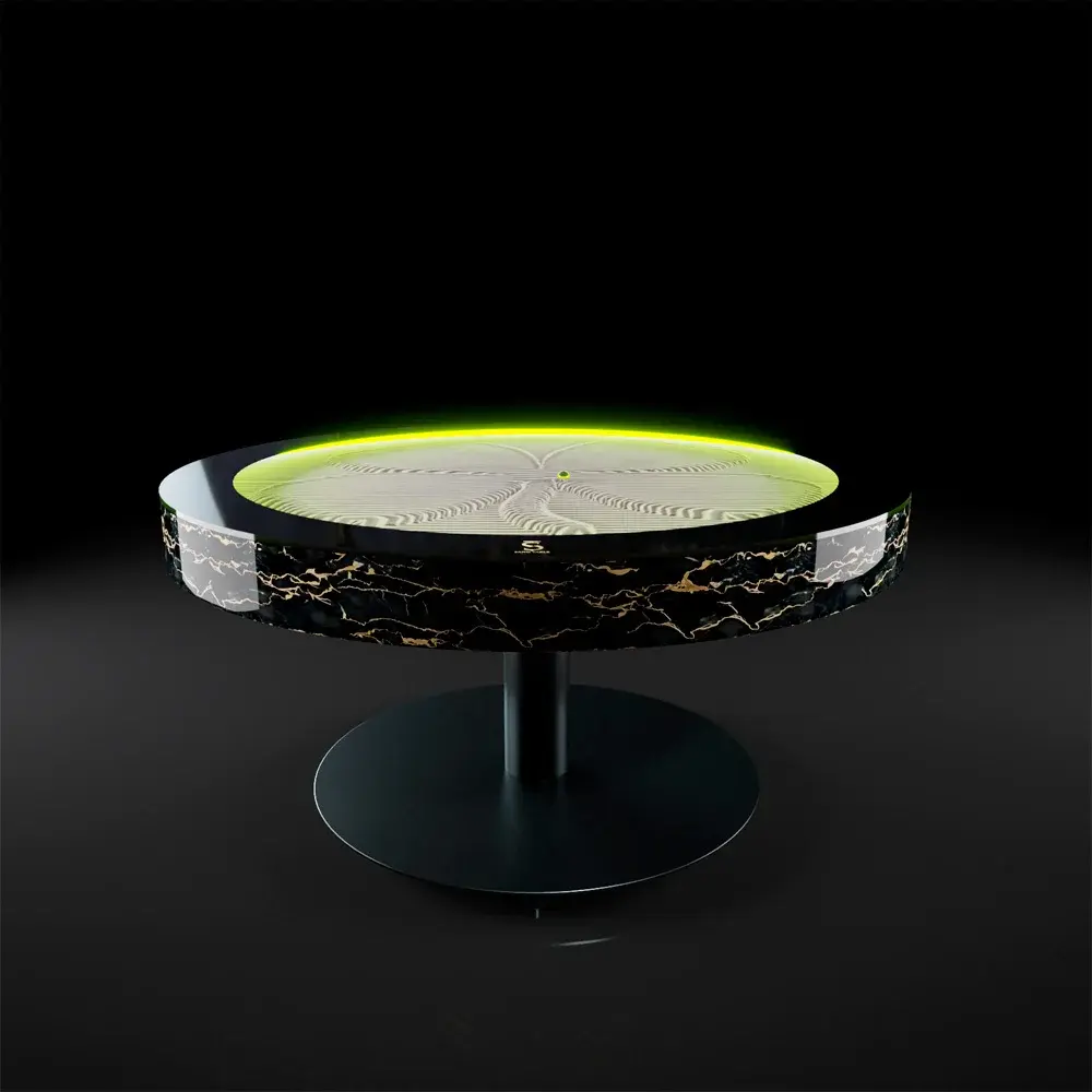 Для любителей острых ощущений, можно выбрать любой цвет подсветки через приложение на iPhone. Стол выдерживает нагрузку до 100 килограмм. Чтобы обеспечить сохранность, столешница накрыта прочным закалённым стеклом Optiwhite, что позволяет в полной мере насладиться движением металлического шара по песку. К столу добавлены модули беспроводной зарядки, чтобы заряжать телефоны, часы, наушники и т.д.
