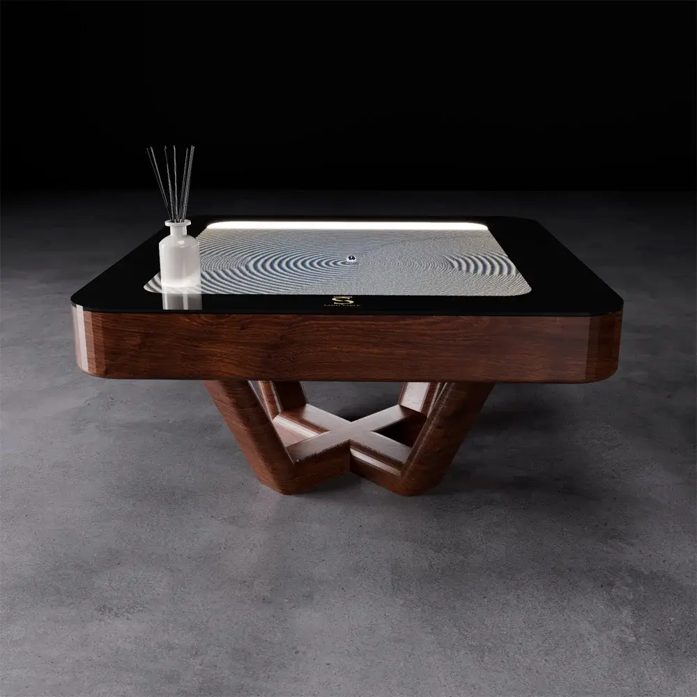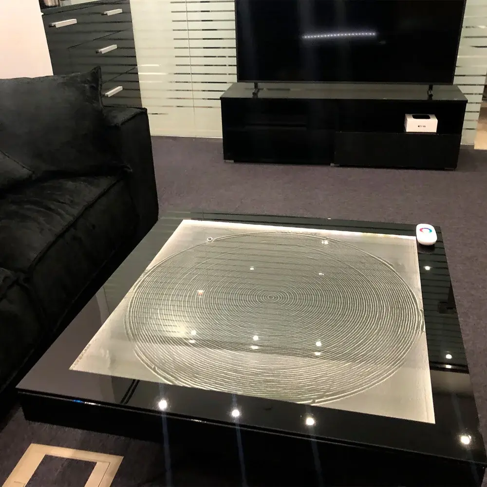Для любителей острых ощущений, можно выбрать любой цвет подсветки через приложение на iPhone. Стол выдерживает нагрузку до 100 килограмм. Чтобы обеспечить сохранность, столешница накрыта прочным закалённым стеклом Optiwhite, что позволяет в полной мере насладиться движением металлического шара по песку. К столу добавлены модули беспроводной зарядки, чтобы заряжать телефоны, часы, наушники и т.д.