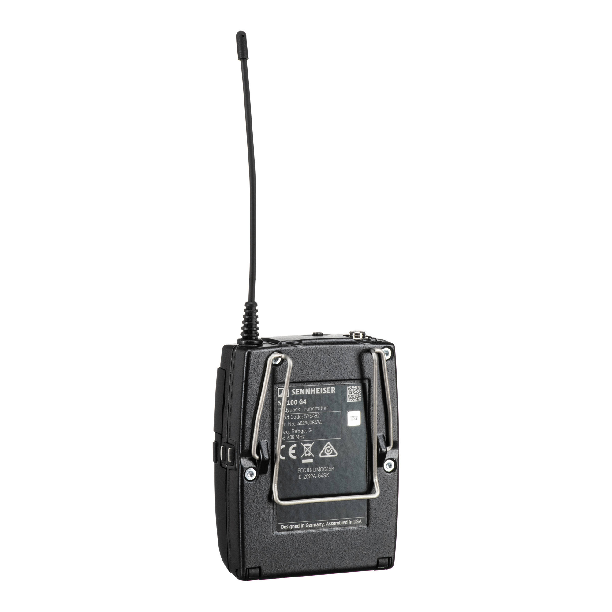 Поясной передатчик SK 100 G4 имеет максимальную выходную мощность 30 мВт, что позволяет ему точно передавать сигнал без потери частот на большом расстоянии. Диапазон частот зависит от источника сигнала и при подключении микрофона будет простираться от 80 Гц до 18 кГц, а при коммутации с электрогитарой или бас-гитарой от 25 Гц до 18 кГц. Питание также происходит от двух батарей типа АА или от Ni-MH аккумулятора, а максимальная продолжительность работы составляет 8 часов. Устройство закрепляется на поясе, не причиняет неудобств и не ограничивает движения за счет малых габаритов и веса. Вход сделан на разъеме 1/8" Jack TRS, который имеет резьбу для фиксации штекера.