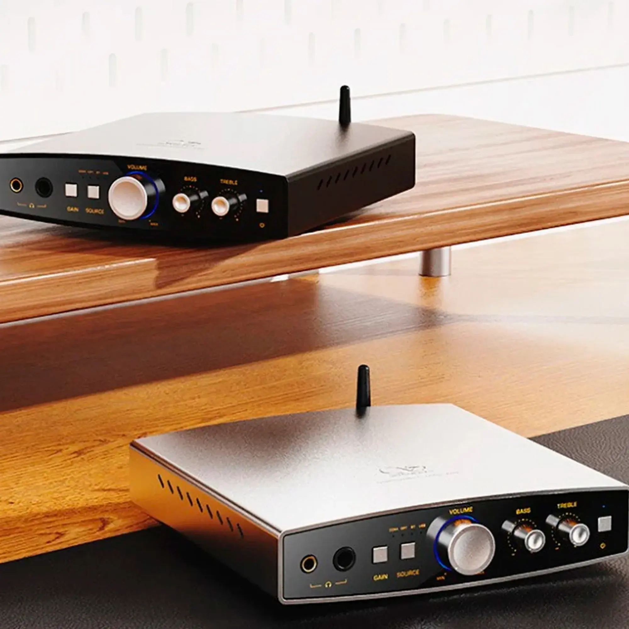 Shanling EH2 поддерживает несколько вариантов подключения, что делает его максимально универсальным. Устройство может быть подключено к компьютеру через USB-C, к смартфону или планшету через Bluetooth, а также к другой аудиотехнике через линейный вход. Благодаря встроенному модулю Bluetooth с поддержкой современных кодеков, таких как aptX HD, LDAC и AAC, EH2 обеспечивает высококачественную беспроводную передачу звука без потери качества. Мощный цифровой усилитель OPA 1612 на транзисторах BD139/BD140, получающий питание от USB или 12 В постоянного тока, обеспечивает мягкое и насыщенное звучание, которое также можно подстраивать с помощью НЧ/ВЧ регуляторов.