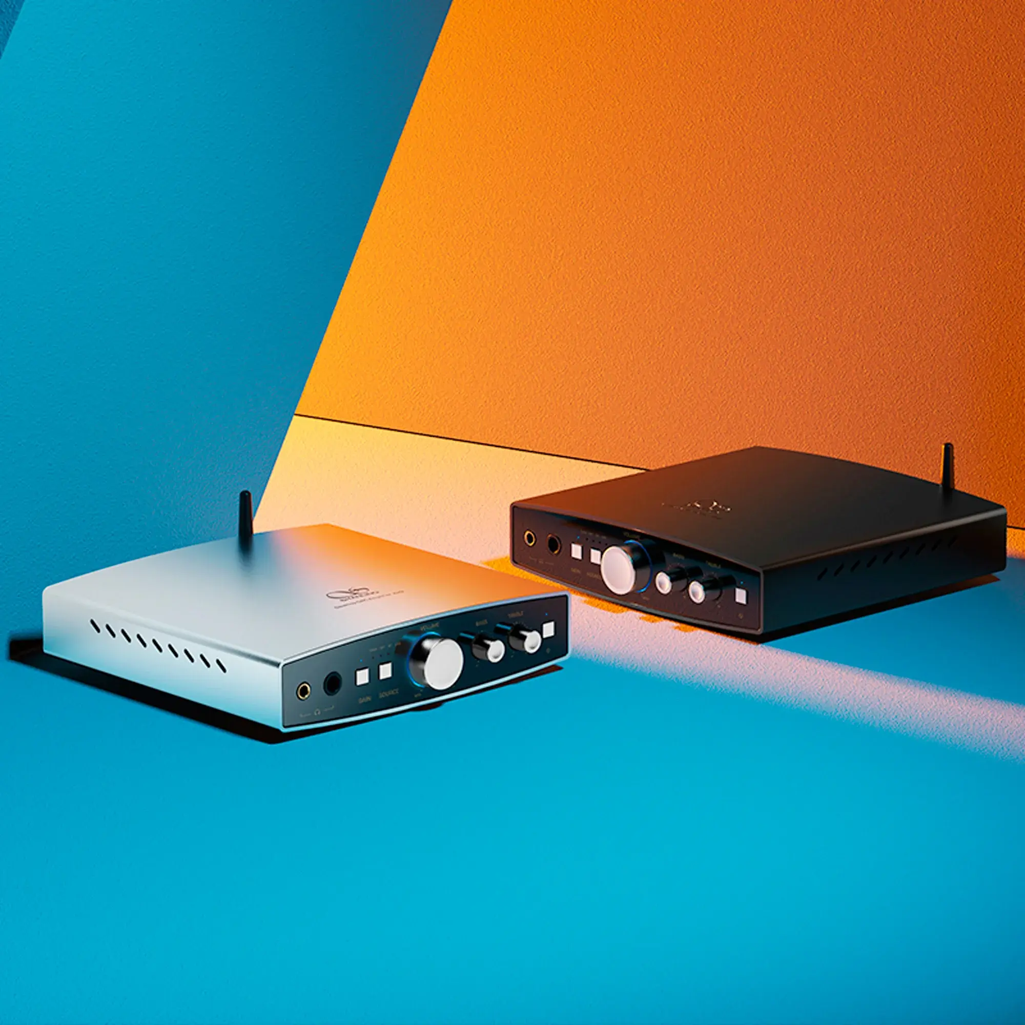 Компактный настольный усилитель для наушников со встроенным цифроаналоговым преобразователем. Никаких экранов и сложного управления - только физические кнопки, темброблок, селектор входов и регулятор громкости, расположенный по центру изогнутого алюминиевого корпуса.