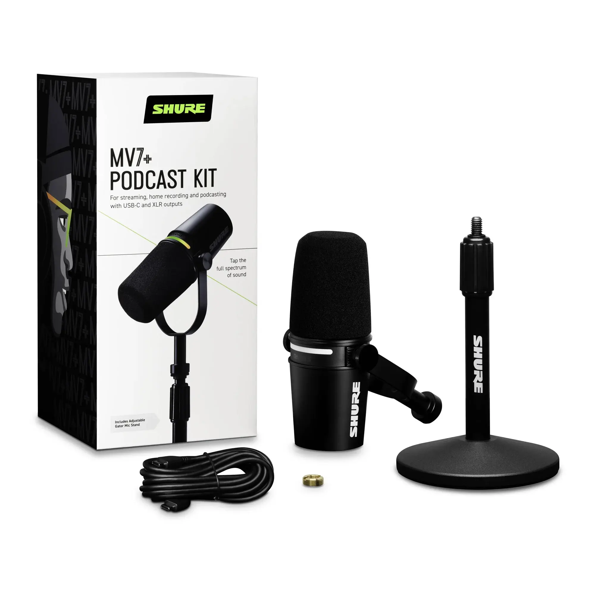 Совместимый практически с любым устройством, MV7+ легко интегрируется в существующий сетап, будь то создание контента в домашней студии или запись на ходу. Микрофон предлагает профессиональный выход XLR для использования с интерфейсами, микшерами и профессиональным аудиооборудованием, что делает его идеальным многоцелевым решением для подкастинга, радио, игр, озвучивания и студий звукозаписи. Он также поддерживает выходы USB-A и USB-C для Mac и ПК. Когда требуется мобильность и запись в дороге, MV7+ работает с некоторыми устройствами Android. Кабель Lightning необходимо приобрести отдельно для использования микрофона с iPhone и iPad.