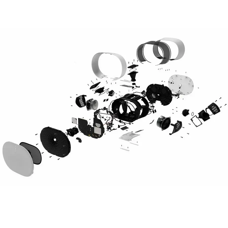 От других колонок Sonos Era 300 отличается формой корпуса, которая напоминает песочные часы (прим.ред.: на наш взгляд, весьма отдалённо…). По мнению разработчиков, именно такой форм-фактор является идеальным для достижения эффекта окружающего звучания. Внутри корпуса с габаритами 160 x 260 x 185 мм (вес колонки – почти 4,5 кг) шесть динамиков: четыре высокочастотника и пара вуферов; они установлены под углом для лучшей дисперсии.