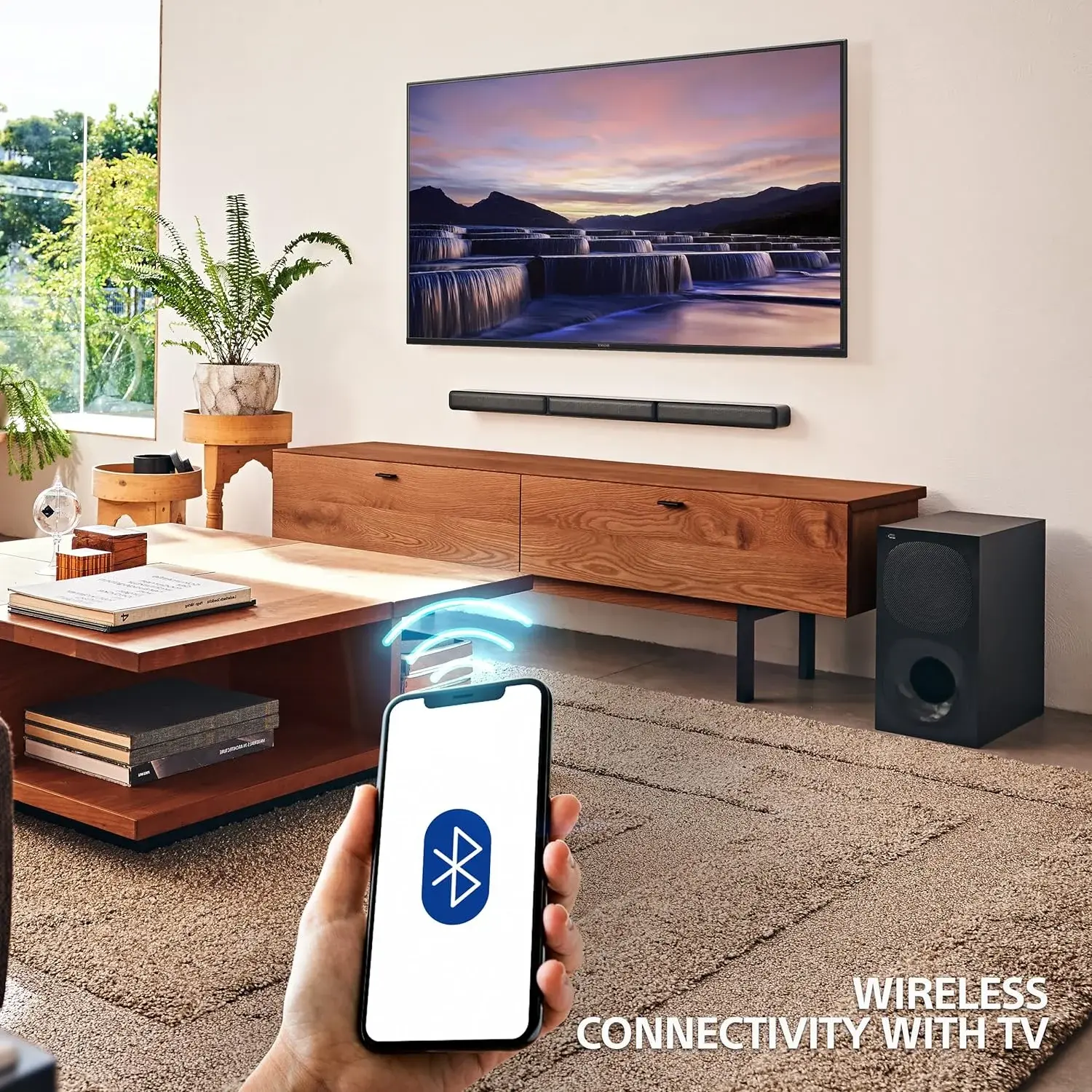 HT-S40R идеально сочетается с телевизорами BRAVIA и гармонично вписывается в интерьер гостиной вместе с тонким и компактным саунбаром, малозаметным сабвуфером и беспроводной тыловой акустической системой.