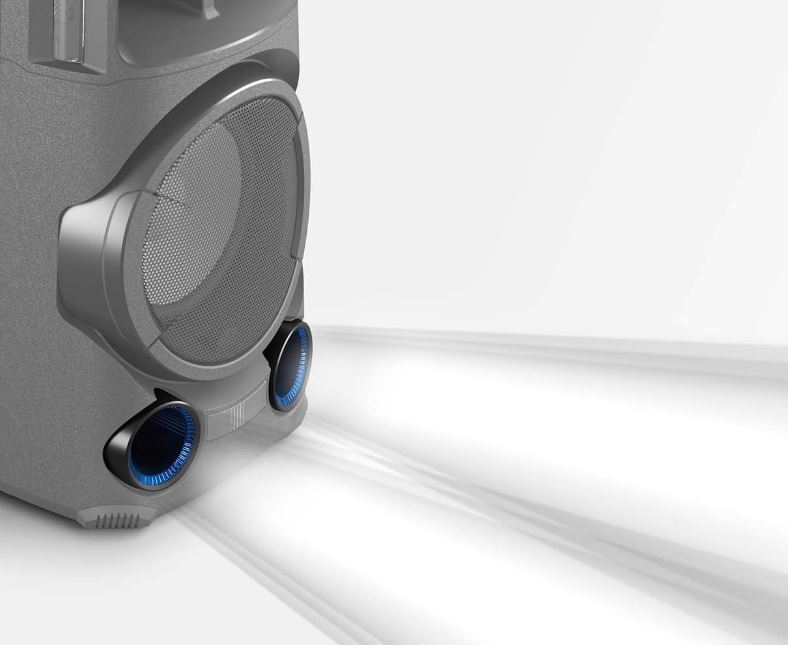 Высокоэффективные среднечастотные динамики, расположенные спереди, распространяют звук повышенной четкости и обеспечивают необходимое звуковое давление в среднечастотном диапазоне. Вы всегда будете четко слышать вокал, танцуя под любимые композиции или подпевая им.