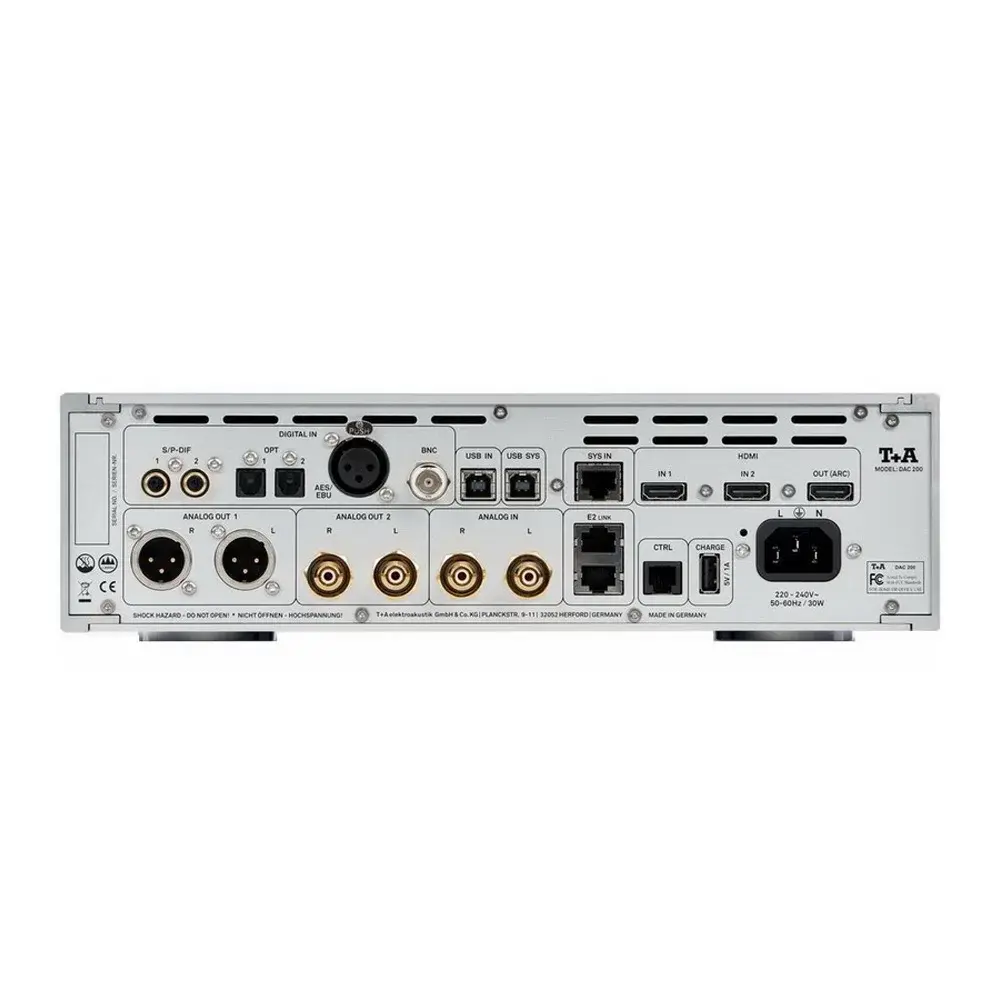 Являясь частью 200-й линейки, Т+А DAC 200 спроектирован для работы с другими устройствами этой серии (усилителем Т+А A 200 и цифровым аудиоплеером Т+А MP 200). Для этого на задней панели размещены служебные разъемы коммутации.