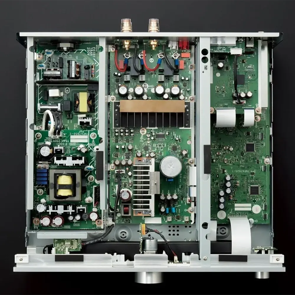 Помимо набора S/PDIF-входов в усилителе имеется асинхронный порт USB (PCM до 32 бит/384 кГц и DSD до 11,2 МГц). Есть вход MM/MC-фонокорректора и два линейных входа, сигнал от которых поступает в АЦП для преобразования в PCM до 24 бит/192 кГц. Присутствуют линейный выход и Pre Out, а для подключения АС служат четыре клеммы. Усилитель получил стрелочные индикаторы уровня сигнала с подсветкой, лицевую панель из алюминия толщиной в 7 мм и двухслойное стальное шасси.