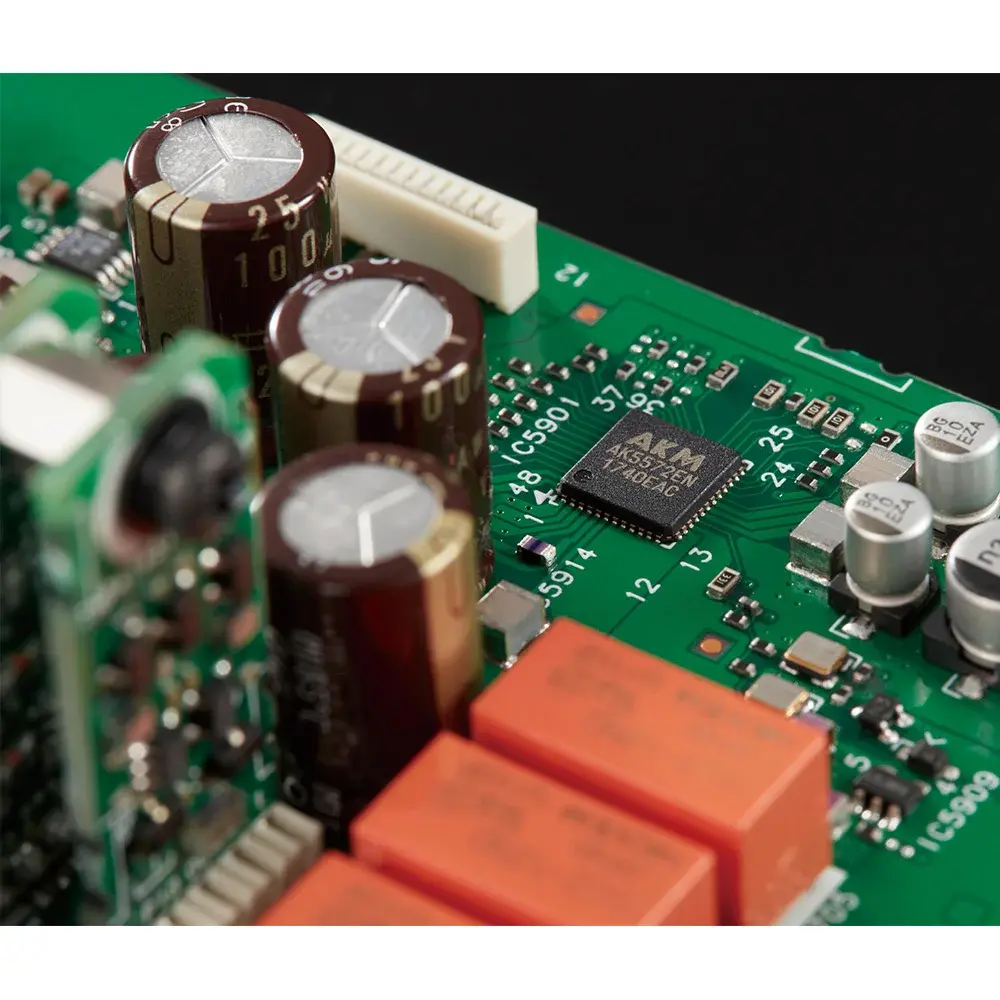 Входной контур USB в секции цифрового входа оснащен конденсатором из высококачественной рубиновой слюды и стабилизатором мощности с немагнитными углеродными пленочными резисторами для блокировки электрических помех, например от ПК, и для минимизации внешнего шума. В АЦП используется высокопроизводительный чип производства Asahi Kasei Microdevices (AKM) для высокоточного аналого-цифрового преобразования. Таким образом, SU-R1000 воспроизводит звук от любых аналоговых или цифровых источников входного сигнала с превосходным качеством.