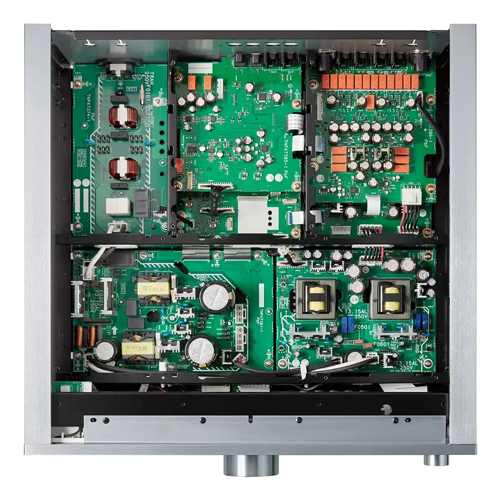Прочность корпуса была значительно увеличена, чтобы уменьшить вибрацию внешних панелей, которые также являются источником шума. Внутри корпус разделен на два яруса. На верхнем ярусе установлена секция усилителя мощности, состоящая из контура усиления и контура блока питания. На нижнем ярусе установлена секция предусилителя, которая состоит из секции аналогового входа, включая фонокорректор, и секции цифрового входа, а также контуров питания для этих устройств. Верхний и нижний ярусы, а также отдельные блоки контуров отделены друг от друга стальными пластинами.