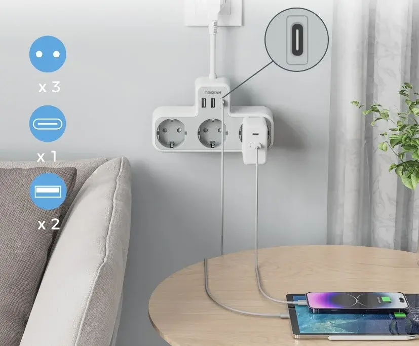 Сетевой фильтр с 3 розетками 220В, 2 USB и 1 USB Type-C портами, на гибком и прочном встроенном 15см кабеле. Эргономичный дизайн. Индикатор LED. Огнеупорный материал корпуса. Надёжные плотные разъёмы, защитные шторки.