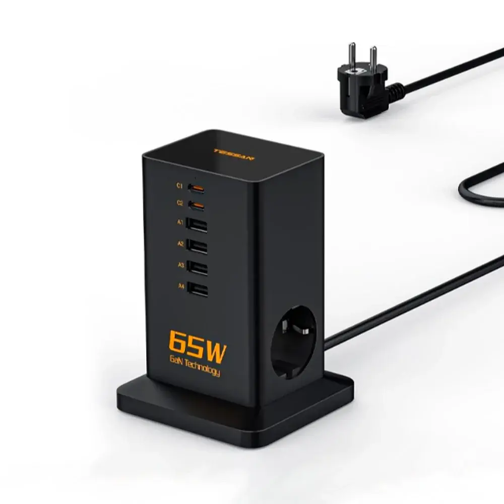 Сетевой фильтр с 2 розетками 220В, 4 портами USB-A и 2 портами USB Type-C. (65 Вт, поддержка PD GaN) кабель 2м. Компактный дизайн. Высокая скорость зарядки. Защита от перегрева и перегрузки.