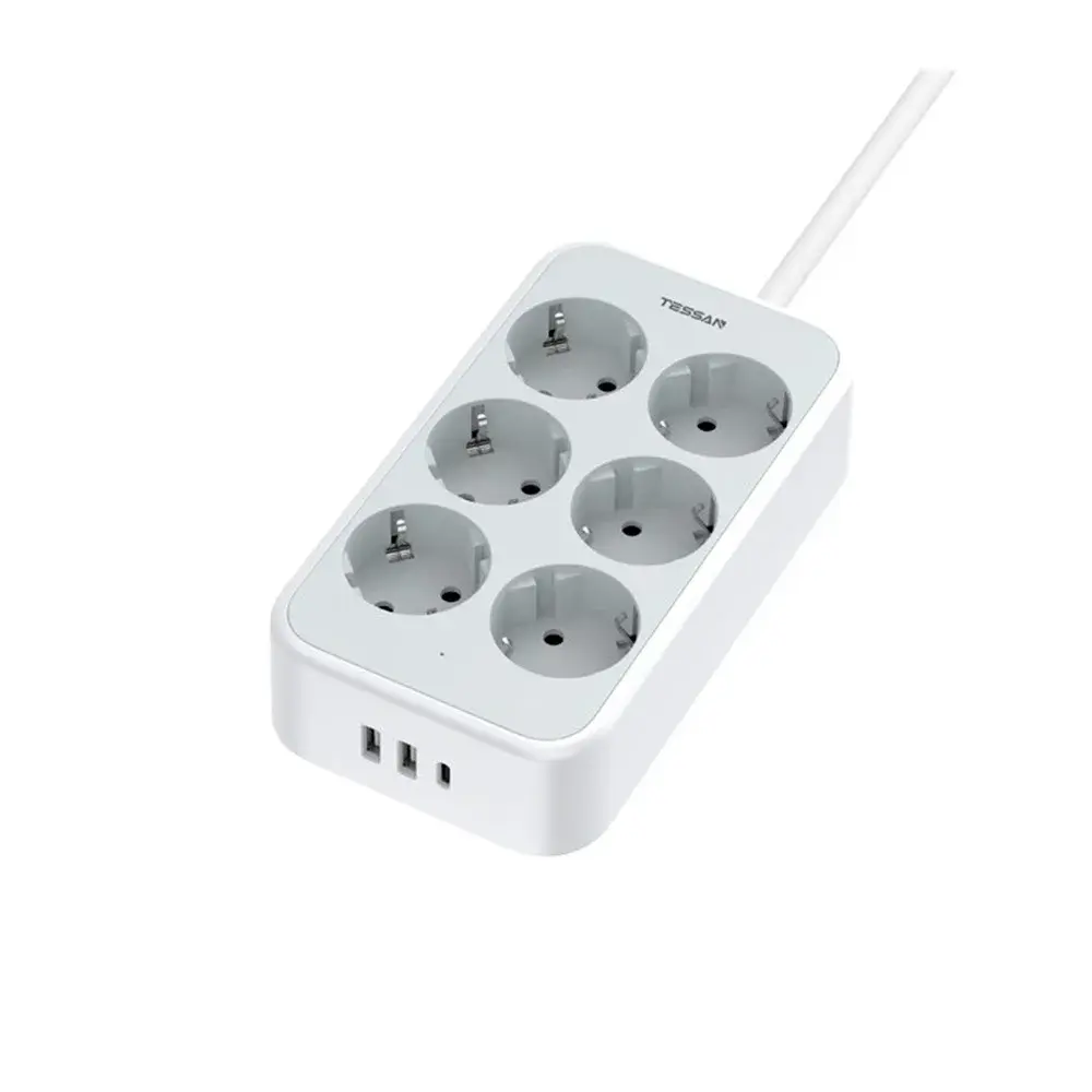 Сетевой фильтр с 6 розетками 220 В, 2 USB-A и 1 USB-C портами и кнопкой питания. Эргономичный дизайн. LED индикатор. Огнеупорный материал корпуса. Высококачественный медный кабель. Надёжные плотные разъёмы. Шторки защиты от детей.