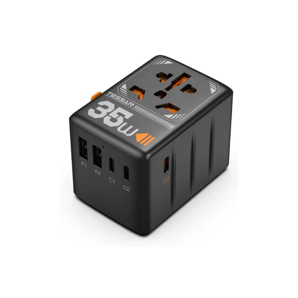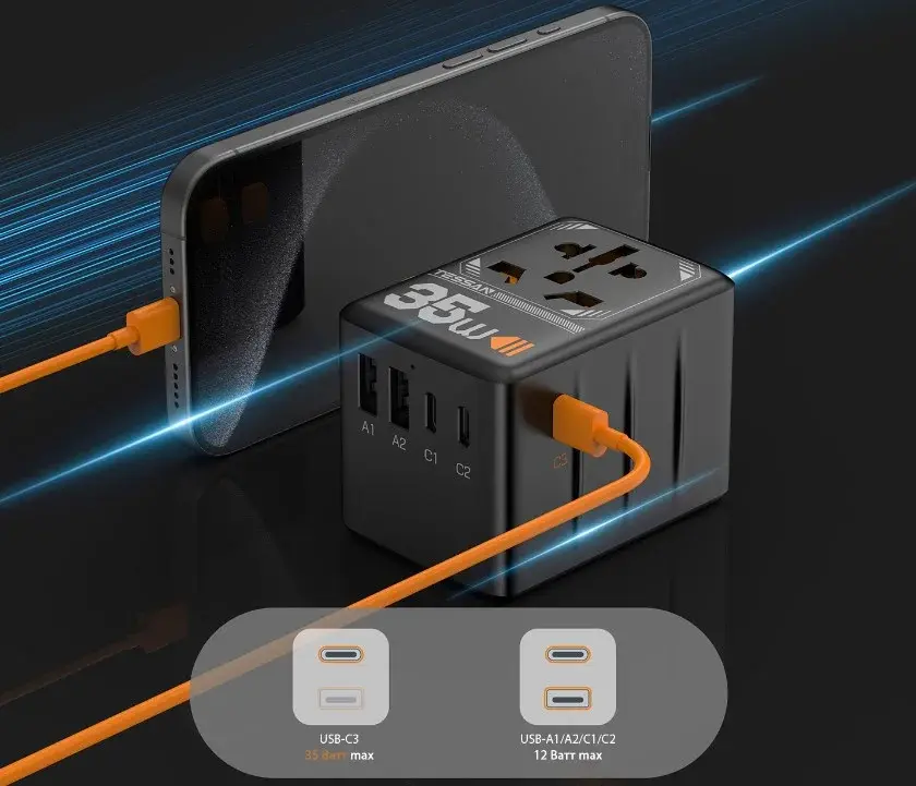 Сетевой фильтр (тревел-адаптер) с неск вар 100-250В, 2 USB и 3 USB-C портами. Эргономичный дизайн. Огнеупорный материал корпуса. Надежные плотные разъёмы.
