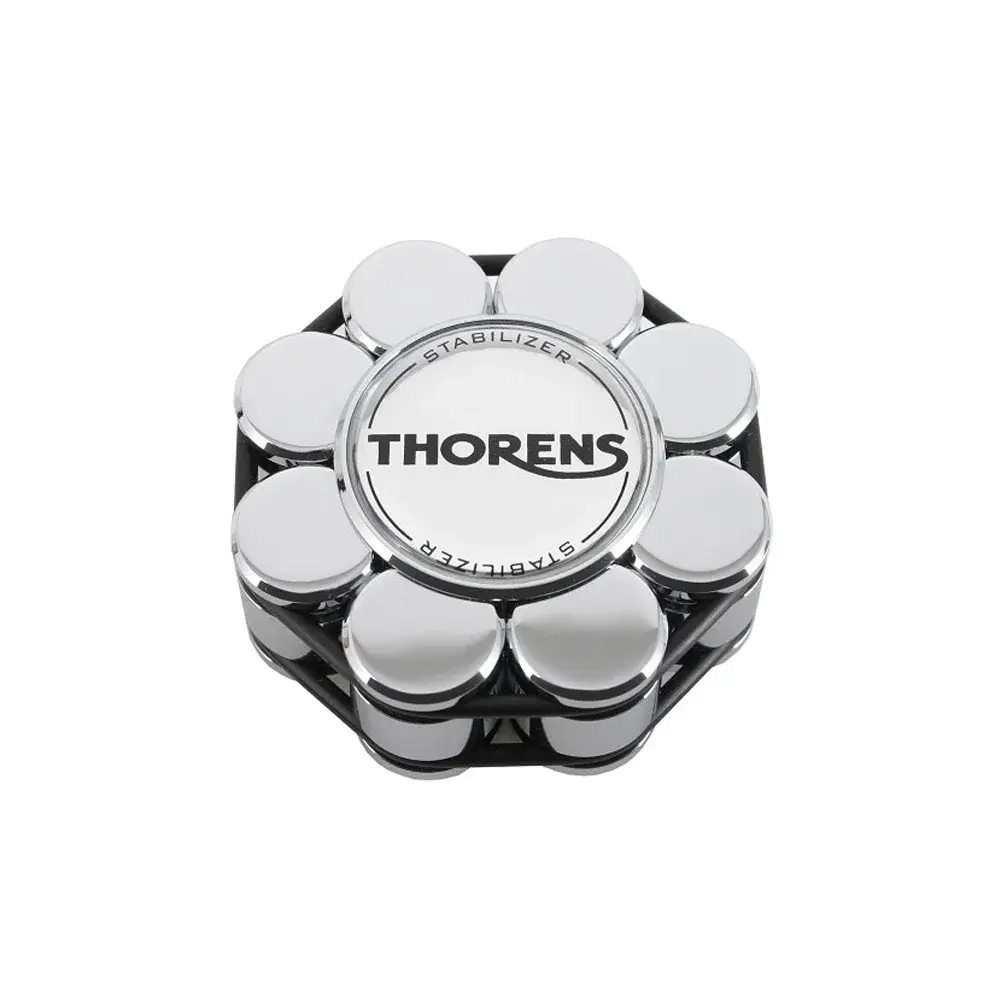 Стабилизатор Thorens улучшает контакт виниловой пластинки с диском проигрывателя, оснащенным фетровым или каучуковым матом. 8 сбалансированных грузов общим весом в 550 г. помогают исправить небольшие деформации пластинок, а так же успешно поглощают их вибрацию и резонанс. Стабилизатор поставляется в элегантной деревянной шкатулке.