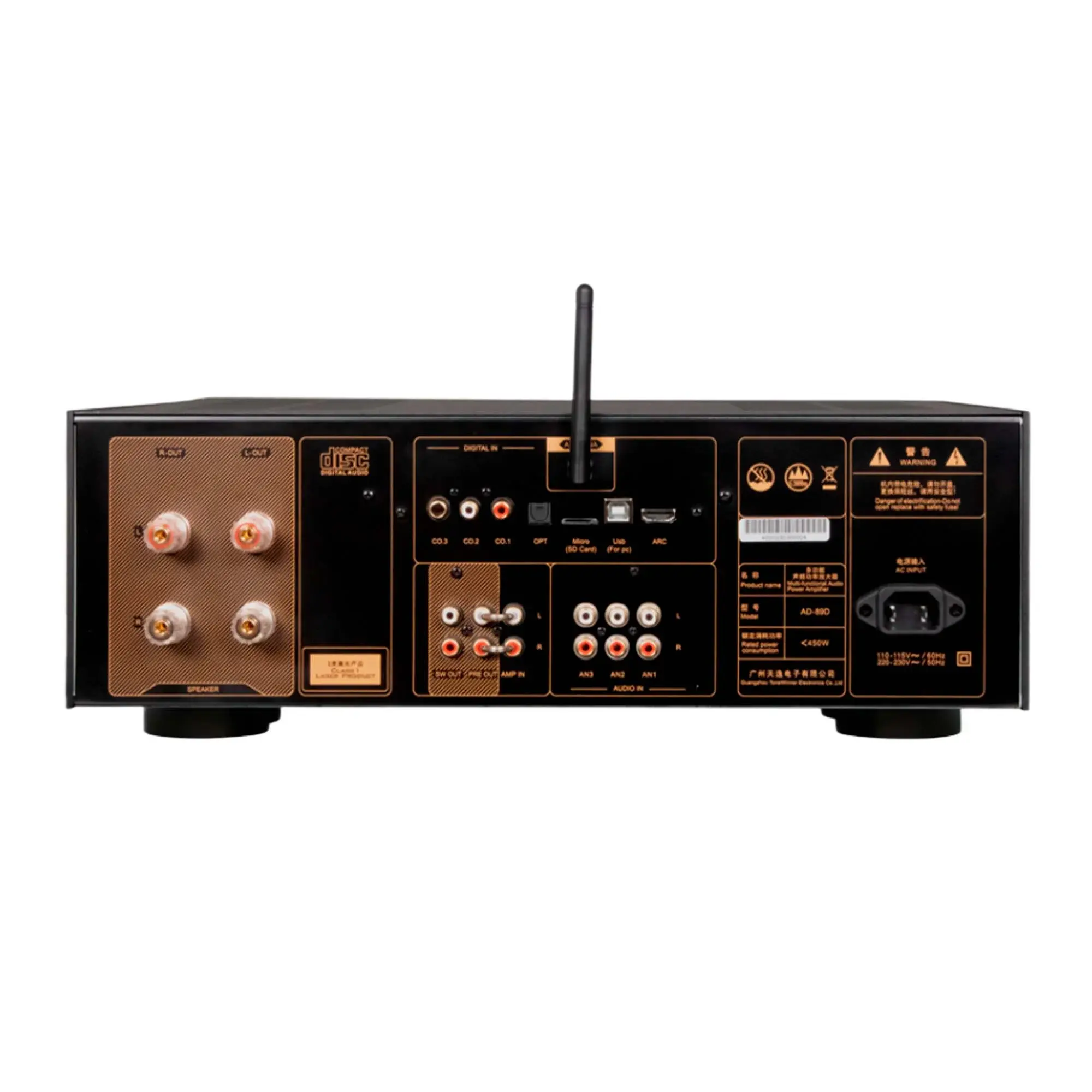 Файловый плеер воспроизводит музыку в форматах FLAC, APE, WAV, MP3 и WMA. Встроенный ЦАП может получать сигнал не только от CD-привода — у AD89D исчерпывающий набор цифровых входов: три коаксиальных, оптический, HDMI ARC для подключения телевизора, слот для SD-карт, а также два порта USB. Один из них асинхронный, а второй, что на лицевой панели, предназначен для различных USB-накопителей. Максимальное разрешение сигнала по всем входам — 24/192. Выходная мощность 130 Вт/8 Ом на канал обеспечивает для подключения большой выбор акустических систем.