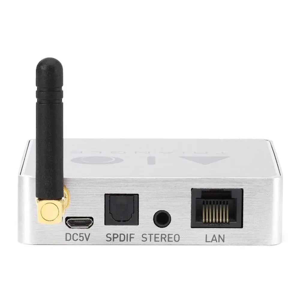 Для подключения к аудиосистеме или активным спикерам на борту стримера имеется аналоговый 3,5 мм стерео-выход, а также оптический выходной разъем, позволяющий подключаться к внешнему ЦАПу, AV-ресиверу, усилителю с цифро-аналоговым преобразователем на борту и прочим аудиокомпонентам, оснащенным цифровым входом. Присутствует LAN-интерфейс и разъем для входящей в комплект Wi-Fi-антенны. Имеется разъем Micro-USB для питания от штатного адаптера. Получать питание можно и от других устройств, например, от ноутбука или десктопа.