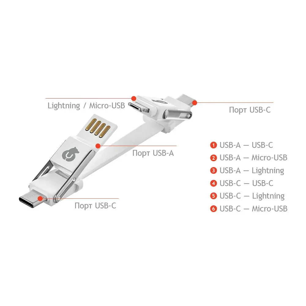 Использовать кабель можно даже в сложенном виде. При этом он занимает вдвое меньше места. Имея невероятно компактный размер и легкий вес гаджет незаменим в поездках. Вы можете заряжать ваши устройства везде и всегда. Минималистичный дизайн кабеля смотрится элегантно и эффектно. Он органично впишется в любой интерьер и дополнит любой образ. Благодаря продуманной конструкции с 4 разъемами кабель обеспечивает до 6 комбинаций соединений для зарядки и передачи данных.