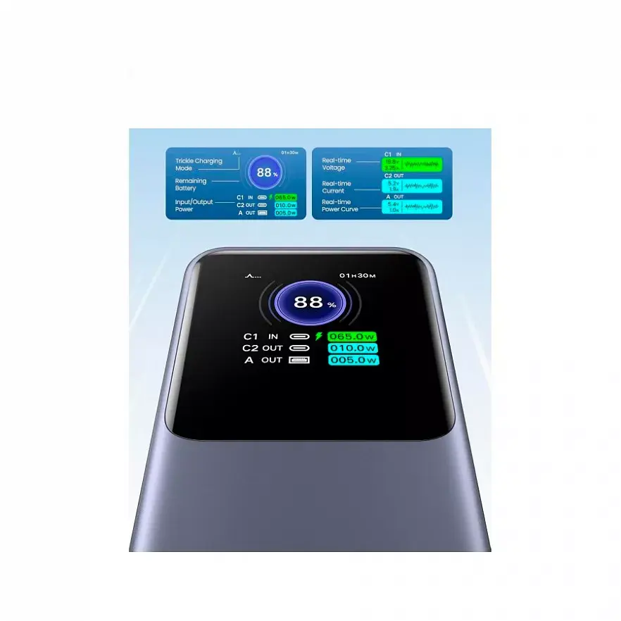 Смарт-дисплей TFT показывает статус заряда, а компактный дизайн "Power Column" весом 609 г (54×50×155 мм) делает его удобным для переноски. Быстрая перезарядка мощностью 65 Вт и надежные литий-ионные элементы на 1000 циклов обеспечивают долговечность.