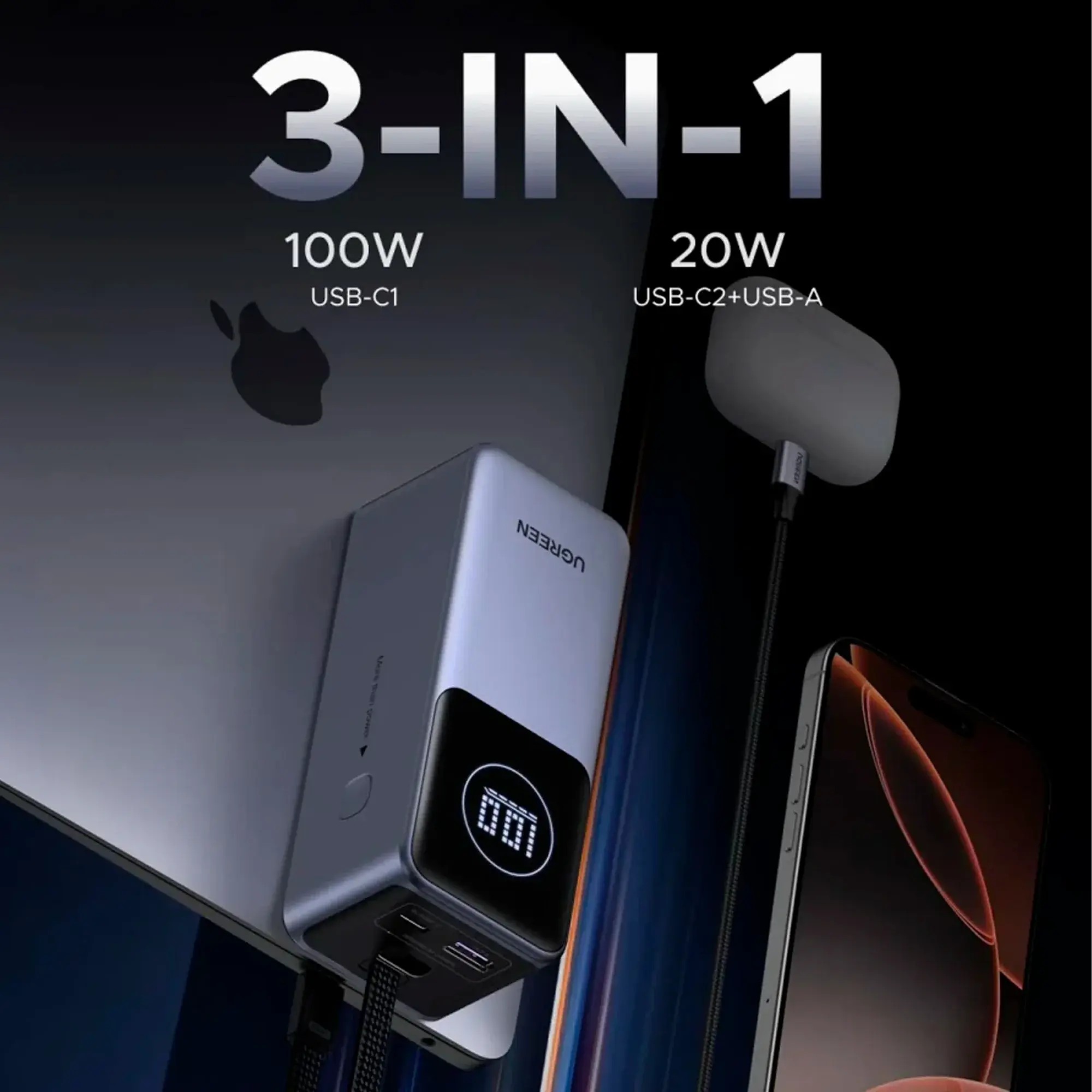 Внешний аккумулятор UGREEN PB723 PD 20000mAh,130W оснащен 2 разъемами 1хType-C + 1хUSB-A и встроенным кабелем USB-C, что позволяет подключить к нему одновременно несколько устройств и не беспокоиться об их безопасности.