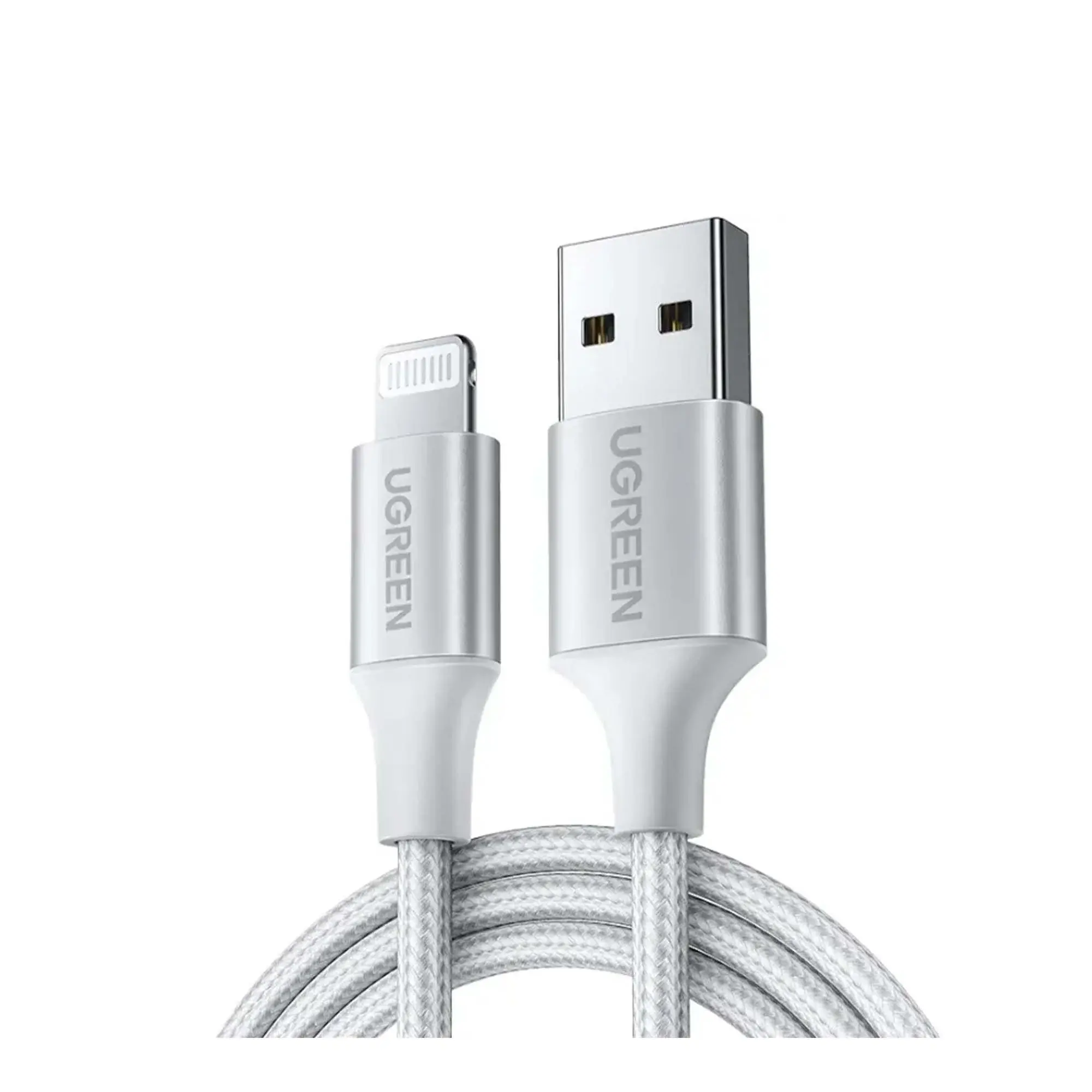 Кабель UGREEN US199 с коннекторами USB-A версии 2.0 и Lightning для передачи данных и выполнен в нейлоновой оплетке неподверженного износу и разрывам.