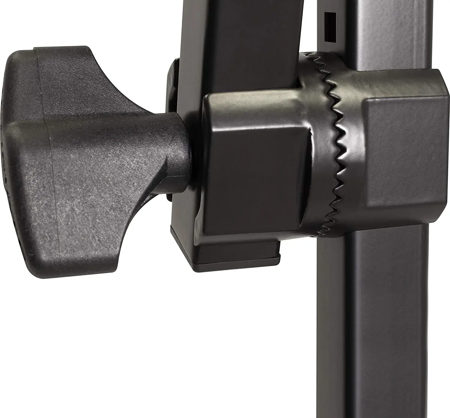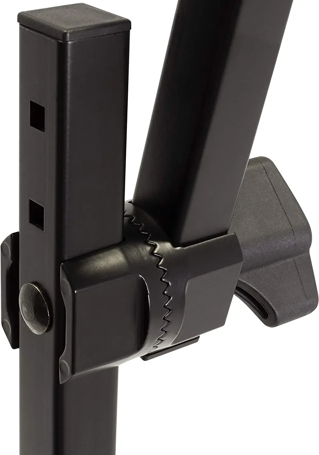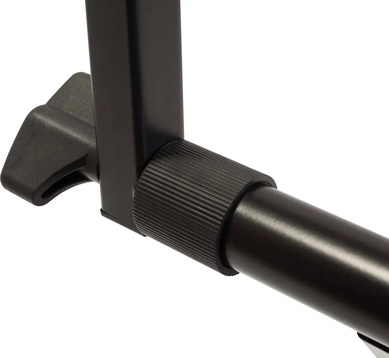 Каждая штанга может менять угол наклона сразу в двух плоскостях: кроме наклона вперед, есть возможность наклонить обе части стойки внутрь друг к другу. Это удобно для поддержки контроллеров и клавишных инструментов меньшего размера. Вы сможете установить в том числе и ноутбук.