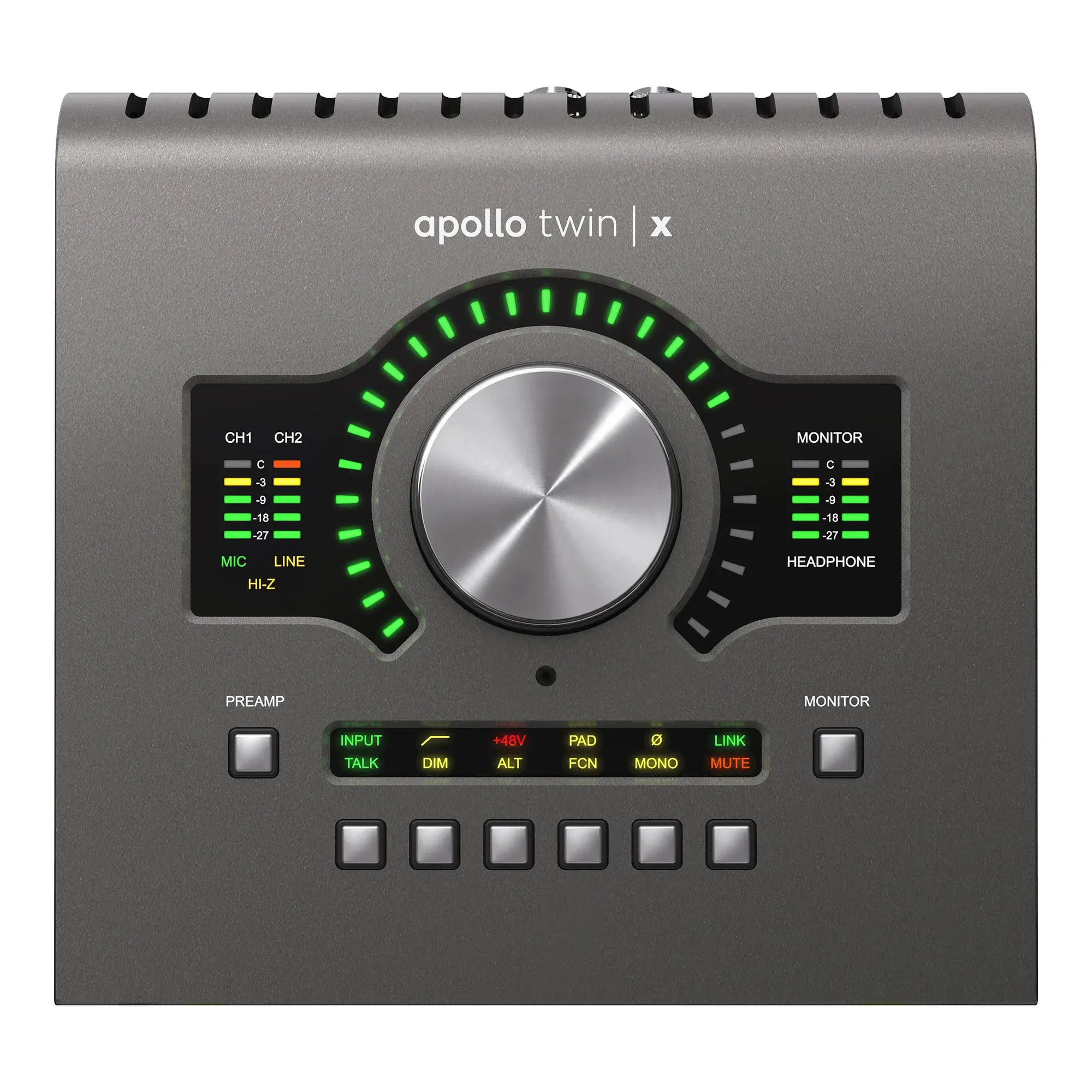 В дополнение к двум микрофонным предусилителям с моделированием Unison, Apollo Twin X предлагает выход для наушников и инструментальный вход Hi-Z. Кроме того, с двумя линейными выходами, оптическим входом и выходом ADAT / SPDIF, расширенной мониторной секцией и встроенным микрофоном Talkback, Apollo Twin X может стать мощным центром вашей профессиональной студии.
