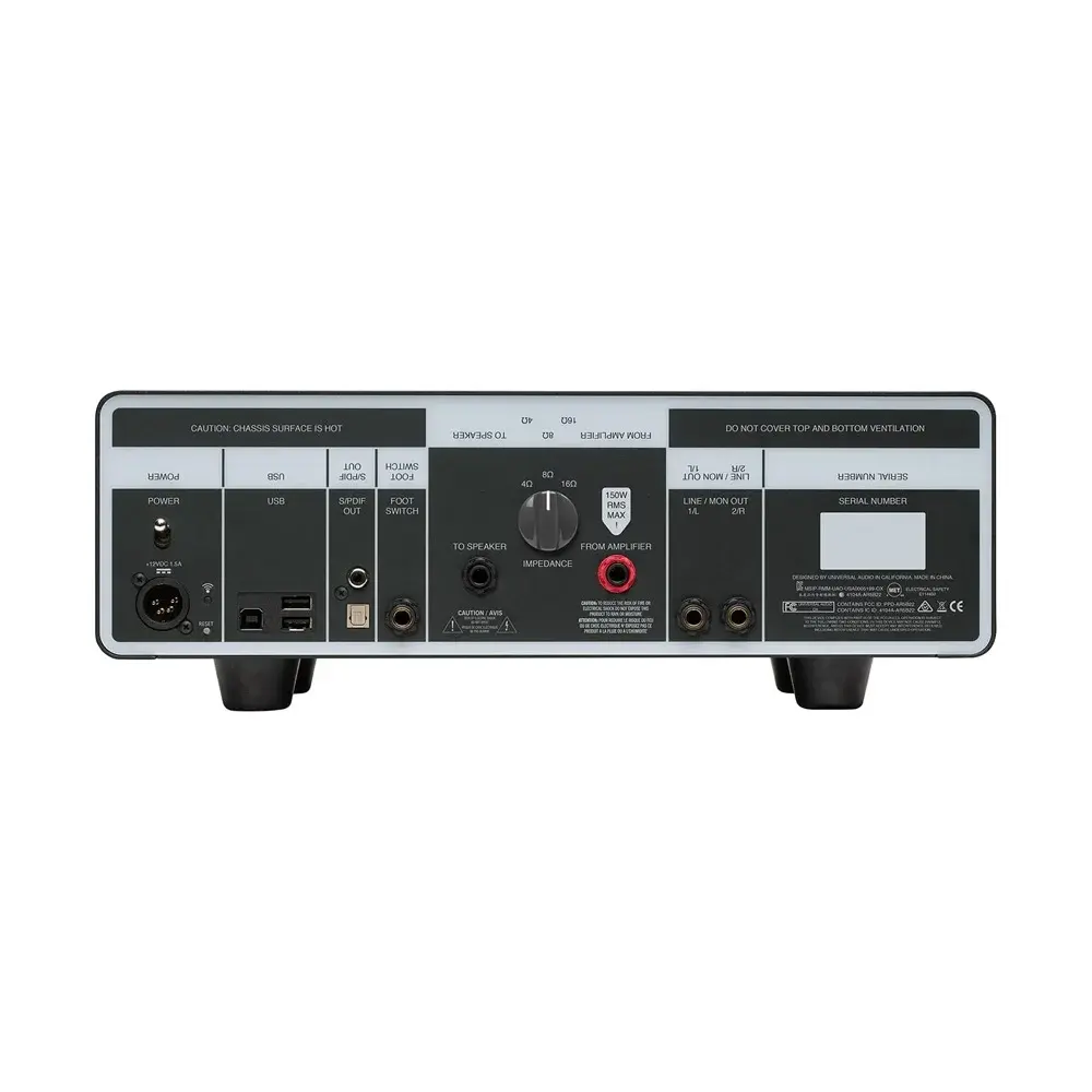 На задней панели размещены коаксиальный и оптический S/PDIF цифровые выходы, трехпозиционный переключатель импеданса (4, 8 и 16 Ом), выход для спикера, вход для сигнала с усилителя ¼” и выходы Line/Monitor ¼”. Universal Audio OX Amp Top Box может управляться с помощью бесплатного приложения OX App для Mac и iPad с использованием встроенного Wi-Fi или имеющейся сети Wi-Fi.