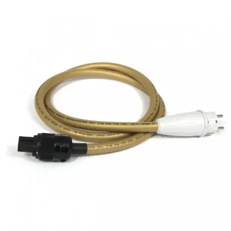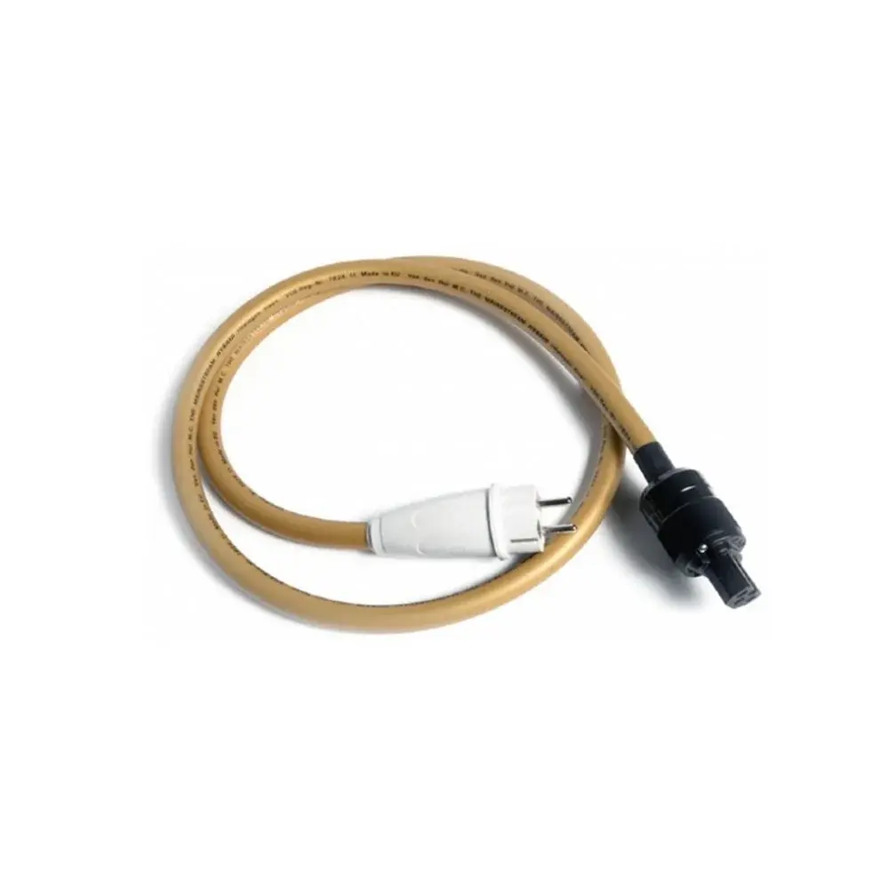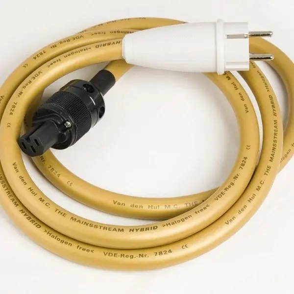 Кабель Van Den Hul Mainserver можно рассматривать как стража, грудью защищающего соединительные кабели оборудования и проводку подачи питания от загрязненной различными помехами электрической сети, но не накладывающего при этом никаких ограничений на подачу питания. Проводники кабеля Mainserver выполнены из посеребренной бескислородной меди высокой степени очистки, эффективная площадь поперечного сечения каждого из них составляет 0.754 мм² (AWG 18.4), а активное сопротивление равно всего лишь 2.3 Ом/100 м. Токопроводящие проводники кабеля Mainserver имеют сечение 0.754 мм² и допускают протекание непрерывного рабочего тока 6 Ампер, что при напряжении питания переменного тока 230 В эквивалентно мощности 1.4 кВт. Оболочка кабеля из материала HULLIFLEX ® 4 золотистого цвета и экраном под ней делают кабель Van Den Hul Mainserver невероятно прочным.