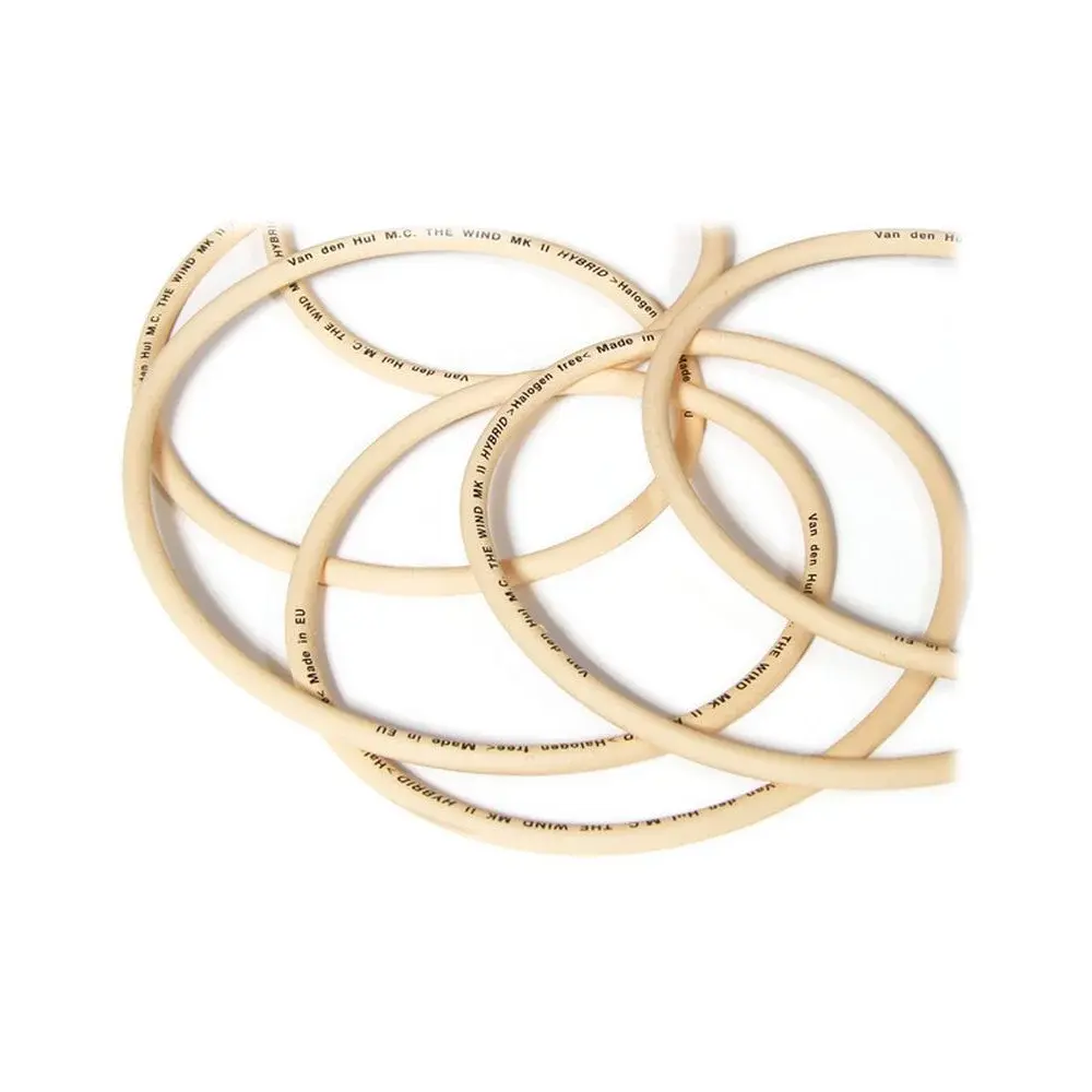 Однопроводной многожильный акустический кабель Van den Hul The Wind MKII Hybrid имеет сложную конструкцию, результатом которой является очень детализированная передача сигнала с эффектом пространственного звучания. Кабель состоит из 173 не изолированных жил, расположенных в пяти разных слоях и изготовленных из очищенной бескислородной меди с согласованной кристаллической структурой (Matched Crystal OFC) с плотным серебряным покрытием.