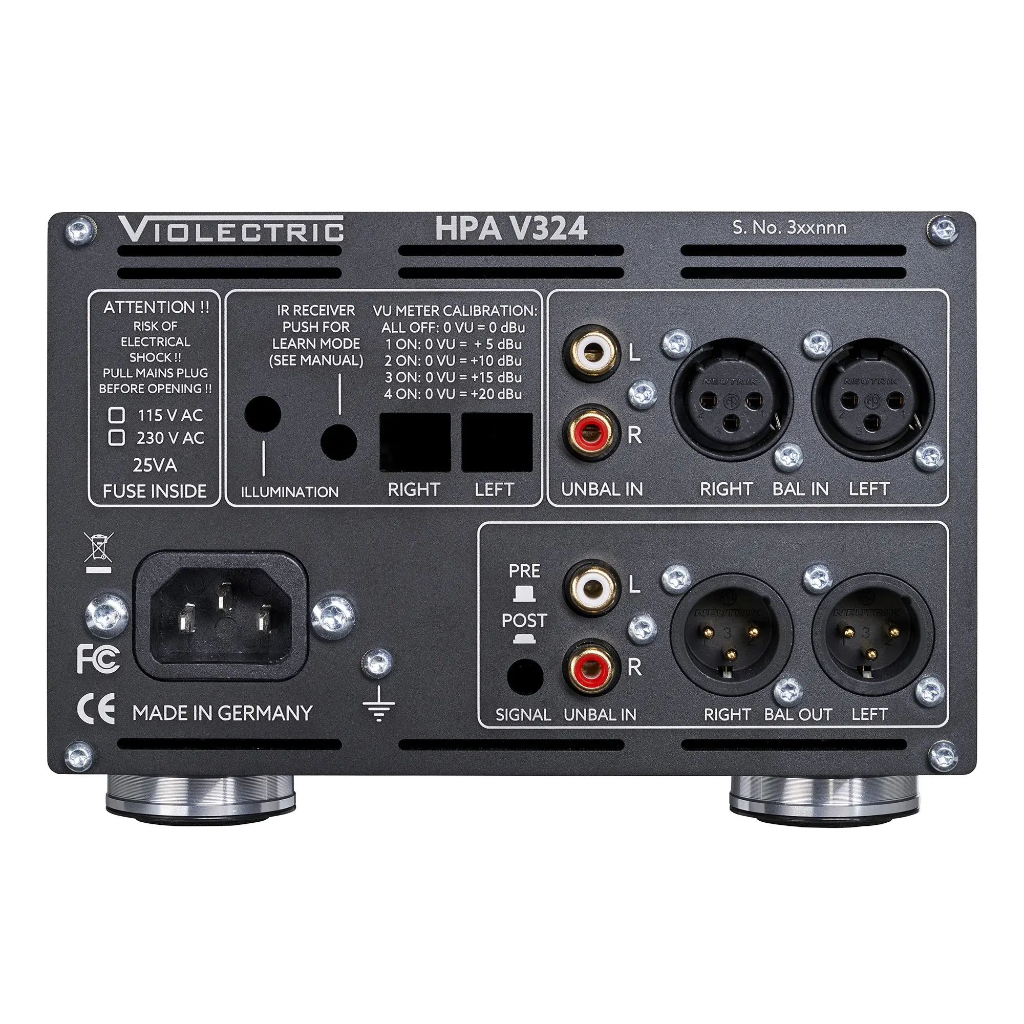 Violectric HPA V324 обладает исключительной универсальностью. Аналоговые входы состоят из несимметричного стереовхода RCA и симметричного XLR. Для наушников на передней панели предусмотрены разъем XLR, 4.4 и 6.3 мм. Внутренняя схемотехника построена с низкой чувствительностью и ее внутренний шум цепи практически не воспринимается на слух при прослушивании.