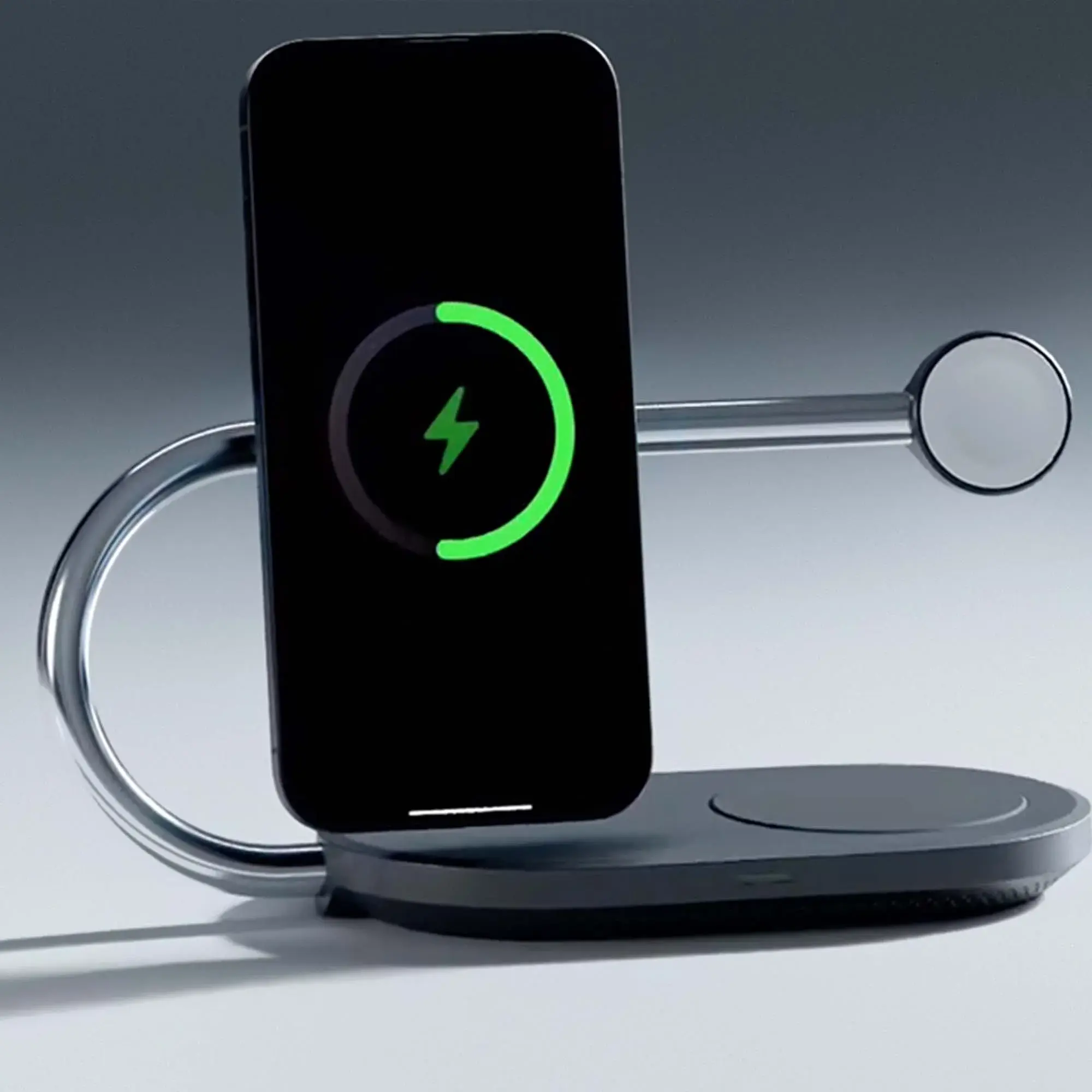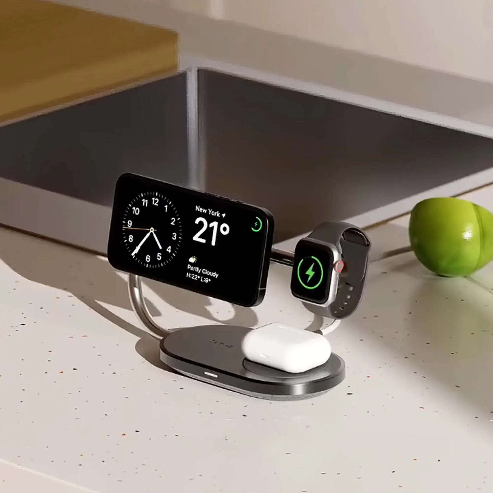 оснащено тремя зонами зарядки, что позволяет одновременно заряжать смартфон, умные часы и наушники;