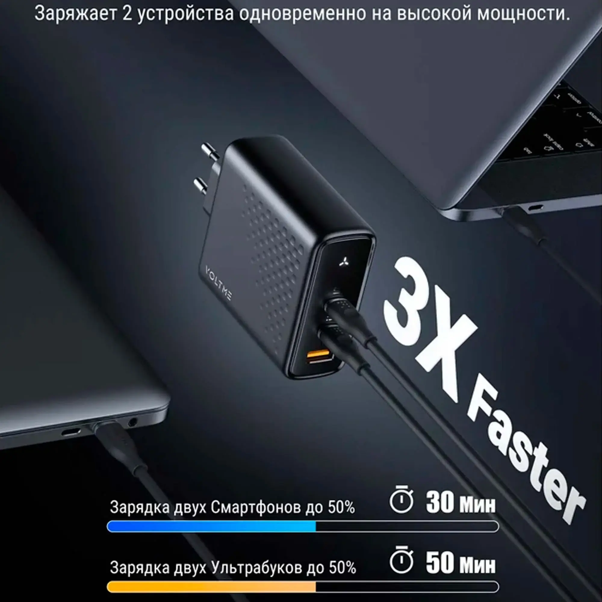 Устройство имеет три выходных разъёма: 2 порта USB-C и 1 порт USB-A. Это позволяет одновременно заряжать сразу три устройства - например, смартфон, планшет и ноутбук — без потери скорости или эффективности. Также VOLTME Revo 140CCA умело распределяет мощность между активными портами, чтобы каждый из них получал оптимальную скорость зарядки.