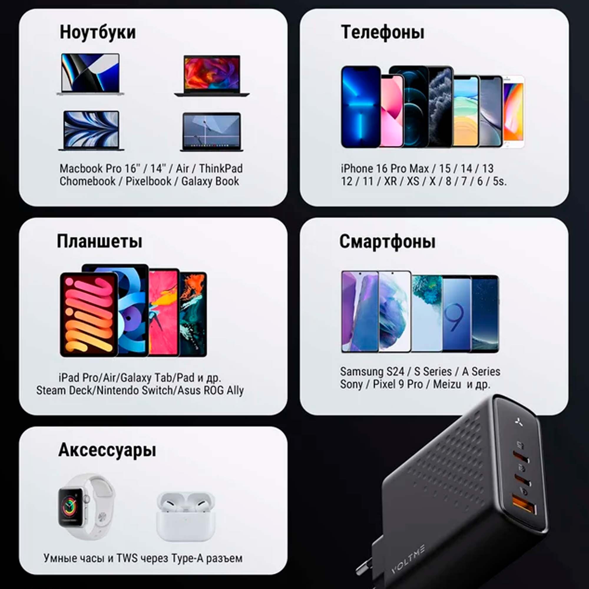 Устройство имеет три выходных разъёма: 2 порта USB-C и 1 порт USB-A. Это позволяет одновременно заряжать сразу три устройства - например, смартфон, планшет и ноутбук — без потери скорости или эффективности. Также VOLTME Revo 140CCA умело распределяет мощность между активными портами, чтобы каждый из них получал оптимальную скорость зарядки.