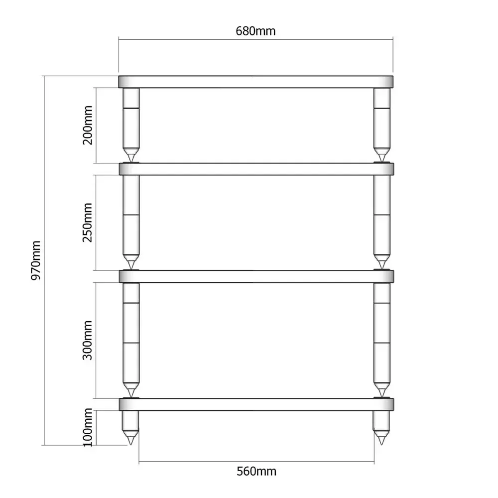 Опорные стойки изготовлены из нержавеющей стали 304-й марки и укомплектованы шипами из термообработанной нержавеющей стали, уменьшающими площадь соприкосновения и значительно повышающие давление, оказываемое элементами, установленными на полке и как следствие гасящими большую часть паразитных колебаний.
