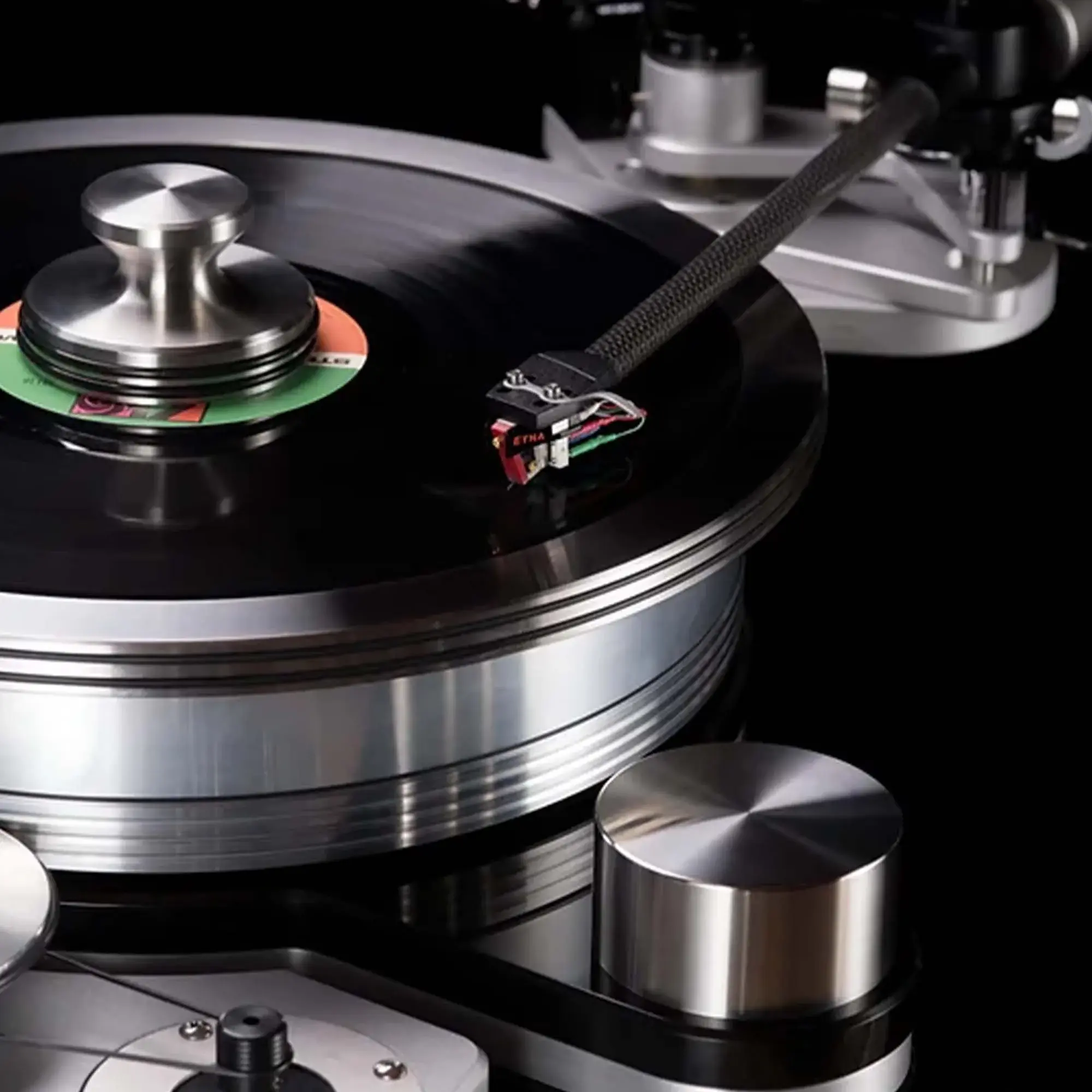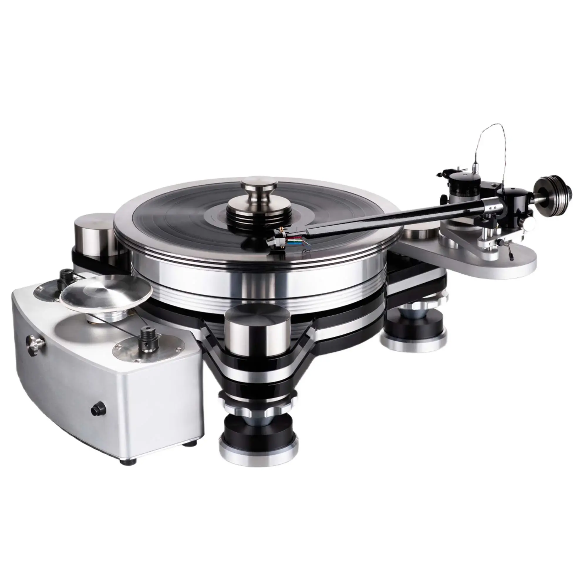 Два 24-полюсных синхронных двигателя переменного тока c частотой вращения 300 об/мин вместе с роликовым приводом находятся в отдельном корпусе из стали и алюминия, что обеспечивает тихую работу и плавную передачу вращения на диск. Инвертированный подшипник состоит из стального закаленного вала с закаленным хромовым шариком наверху, имеющим твердость 60 по шкале Роквелла, а также стакана из фосфорной бронзы с упорным диском из PEEK (PolyEtherEtherKetone). Пассик привода проходит по середине подшипника, что сводит к нулю эффект качелей. Алюминиевый диск на магнитном подвесе весом 11,3 кг изготовлен с допуском +/- 0.02 мм из сплава 6061 и имеет окружность 991 мм.