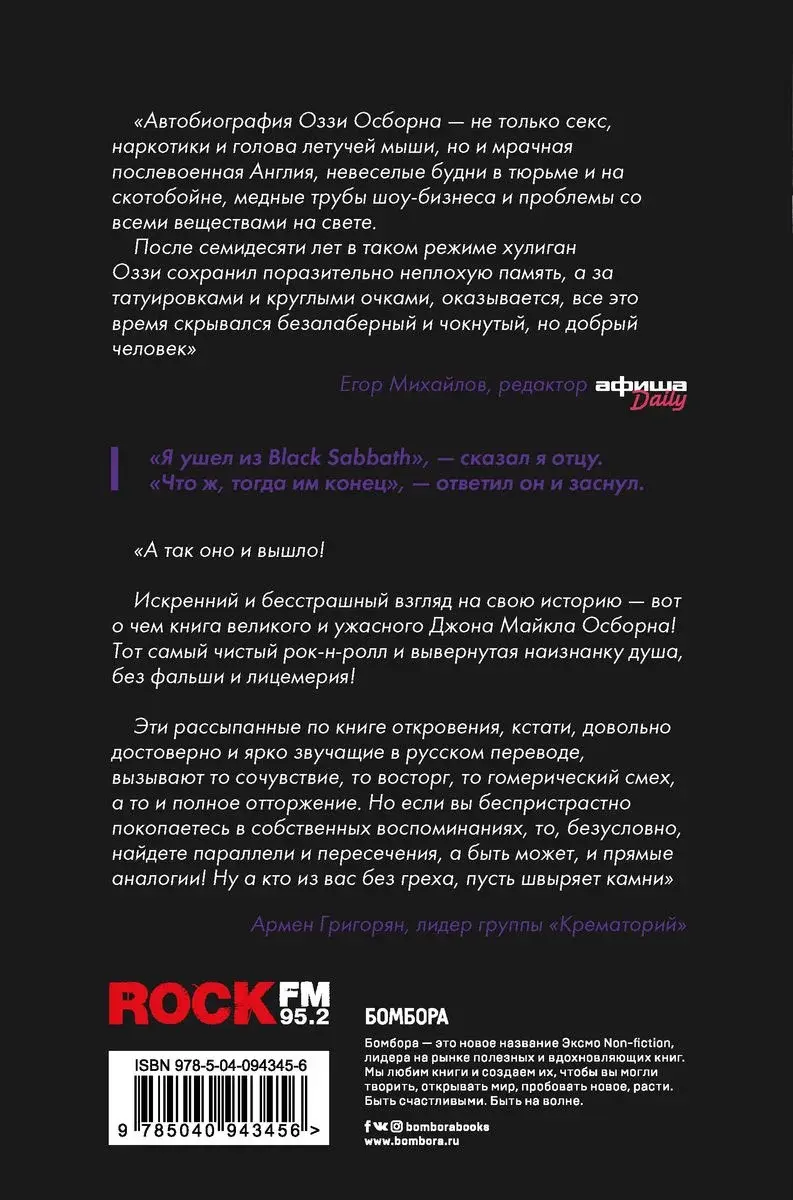 Теперь мне остается только что-нибудь вспомнить..." Для этой книги "великому и ужасному" Оззи Осборну пришлось многое вспомнить: подростковые годы в маленьком промышленном городке в послевоенной Англии, начало музыкальной карьеры (с работы настройщиком автомобильных клаксонов), проступки юности (в том числе криминальные), прорыв на большую сцену и тернистый путь к успеху, которого он совсем не ожидал.