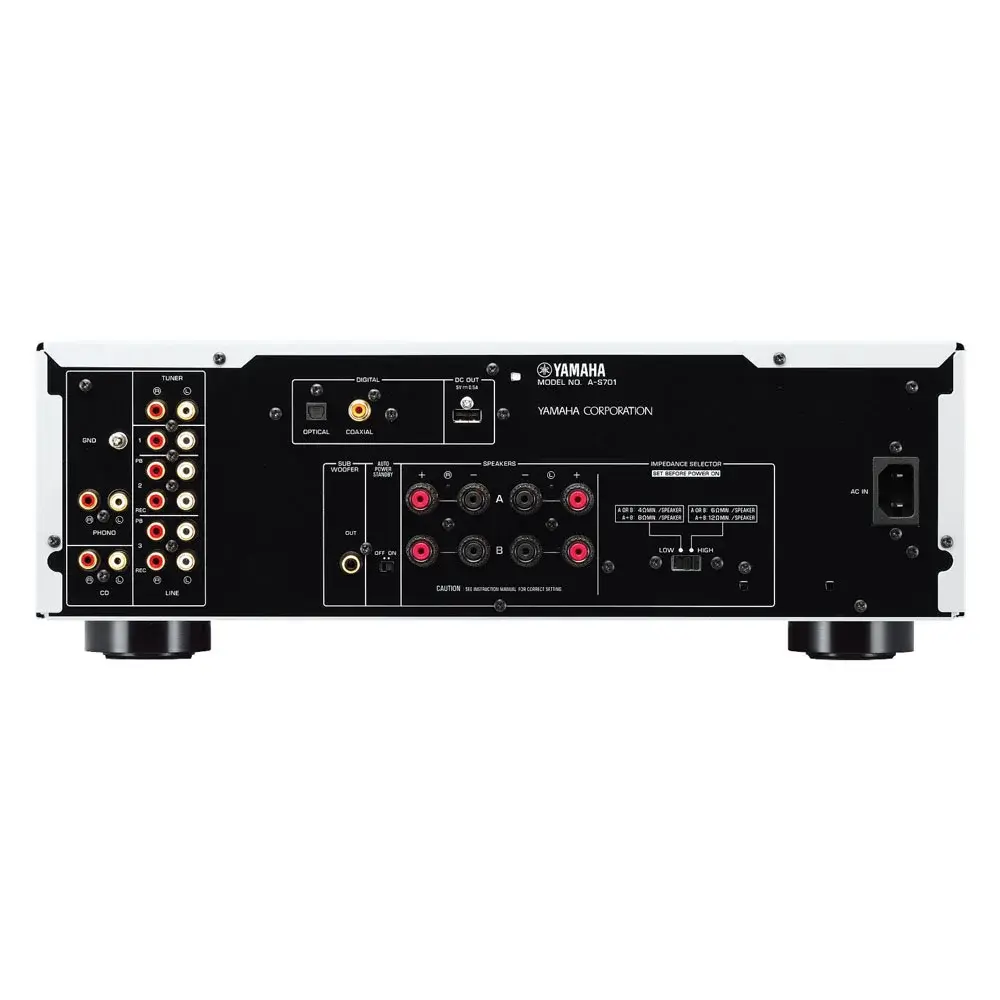 Благодаря наличию встроенного ЦАПа, а также коаксиального/оптического входов к Yamaha A-S701 можно подключать цифровые источники (TV-панель, Blu-ray-проигрыватель и др.). При этом поддерживается прием сигналов в формате PCM до 24 бит / 192 кГц. На борту имеется усилитель для наушников, MM-фонокорректор, набор линейных входов, выходы для записи и разъем для активного сабвуфера. Имеется возможность подсоединения внешнего Bluetooth-модуля YBA-11, поддерживающего кодек aptX. Для подключения спикеров служат четыре пары позолоченных винтовых клемм.
