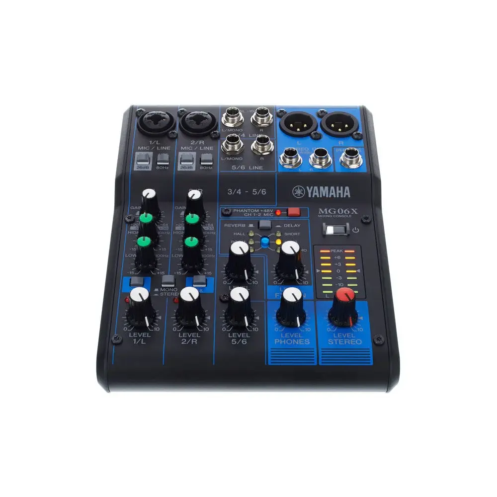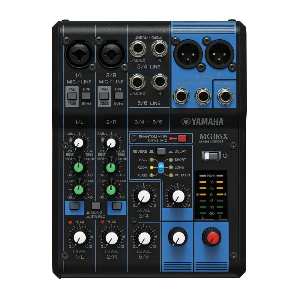 Универсальный микшерный пульт YAMAHA MG06X имеет небольшие, компактные размеры, но при этом очень обширный функционал. Он отлично подойдет как для работы в домашних условиях, так и для работы на сцене. Микшерный пульт имеет шесть рабочих каналов, два микрофонных и шесть линейных входов. Также имеются микрофонные предусилители А-класса, которые стоят на инверторной системе Дарлингтона вместе с высококачественными операционными усилителями M01. Гаджет оснащен всеми необходимыми выходами и разъемами, как для кабеля, так и наушников. Микшерный пульт YAMAHA MG06X на высококачественном встроенном процессоре эффектов SPX с 6-ю программами. Также есть индикаторы пикового уровня, двухполосный эквалайзер hi-pass типа. Пульт заключен в прочный металлический корпус.