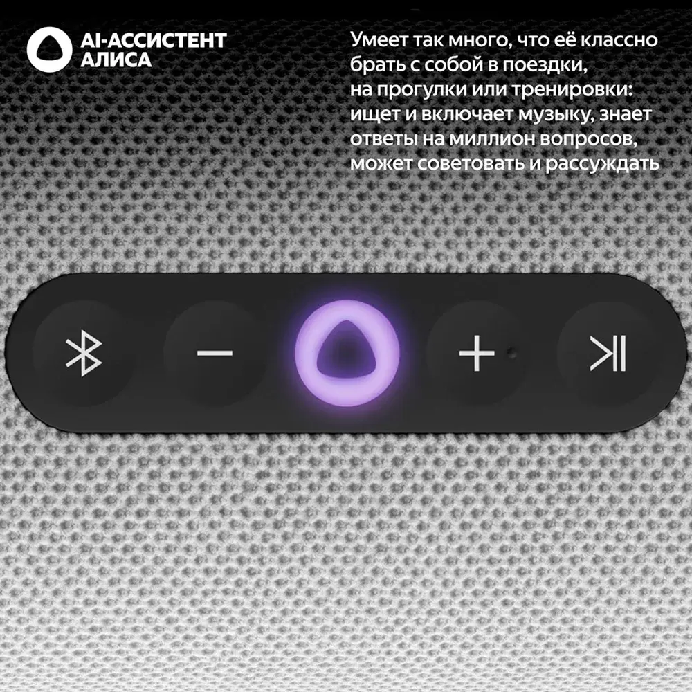 Яндекс Станция Стрит - это идеальная умная колонка для любителей музыки, которые всегда находятся в движении. Мощный адаптивный звук, автономное воспроизведение через Bluetooth и устойчивость к воздействиям делают ее идеальной для дома, путешествий и прогулок на природе. Кроме того, благодаря встроенному голосовому помощнику Алиса и бесшовной интеграции с Яндекс Музыкой ваши любимые мелодии всегда под рукой. Особенности: первая портативная умная колонка Яндекса с мощным звучанием, AI-ассистентом; AI-ассистент Алиса: колонка подходит для использования в поездках, на прогулках или тренировках; подключение через Wi-Fi или Bluetooth: умную колонку можно подключить к Wi-Fi точке доступа на смартфоне или связать с телефоном по Bluetooth; мощный звук: два динамика и два пассивных излучателя общей мощностью 30 Вт передают громкий и насыщенный звук; режимы для улицы и помещения: можно выбрать нужный режим звучания в приложении «Дом с Алисой» или включить автоопределение окружения, колонка сама поймёт, где находится и адаптирует звук; аккумулятора умной колонки хватит до 12 часов активной работы, если уровень заряда опустится до 10%, Алиса сообщит об этом, а быстрая зарядка за 30 минут обеспечит 4 часа работы колонки; благодаря высокому классу защиты IP67 колонка устойчива к пыли и воде, а ткань приглушённых цветов не выгорает на солнце; колонку удобно держать в руке, ставить вертикально или горизонтально, а с помощью съёмного ремешка с карабином можно вешать, например, на рюкзак. С помощью Яндекс станции Стрит вы можете легко подключить свой смартфон через Bluetooth и воспроизводить любимые треки прямо с телефона. Даже в автономном режиме голосовое управление остается доступным - просто используйте короткие команды, не активируя «Алису». Не нужно подходить к колонке - она ответит из любого места. Опыт компании Яндекс в области акустики гарантирует, что Станция Стрит обеспечивает мощный, четкий и яркий звук. Устраиваете ли вы вечеринку на открытом воздухе или наполняете музыкой большую гостиную - колонка обеспечивает достаточную громкость и четкость для любого случая. Станция Стрит автоматически настраивает звук в зависимости от окружающей обстановки. Встроенные микрофоны и интеллектуальные алгоритмы анализируют отражения звука, чтобы определить, где находится колонка - в помещении или на улице, и оптимизируют звук в соответствии с этим. При желании вы можете вручную выбрать режим «В помещении» или «На улице» в приложении Дом с Алисой, чтобы получить идеальные впечатления от прослушивания. С Яндекс Станцией Стрит ваша музыкальная библиотека всегда под рукой. Воспроизводите треки, плейлисты Моя волна, подкасты или аудиокниги, где бы вы ни находились. Если вы услышите песню, которая вам нравится, просто скажите: «Алиса, нравится», и она будет сохранена в вашей коллекции Яндекс Музыки. Сервис предлагает точные рекомендации, подстраивая «Мою волну» под ваши вкусы, как новые открытия, так и уже знакомые любимые композиции. Для прослушивания в автономном режиме загрузите треки заранее через приложение Яндекс Музыки - сохраненная музыка всегда будет доступна. Вы также можете создавать плейлисты для различных занятий, чтобы в любой момент подобрать идеальный саундтрек. Эргономичная форма колонки позволяет легко держать ее в руках или переносить с помощью съем
