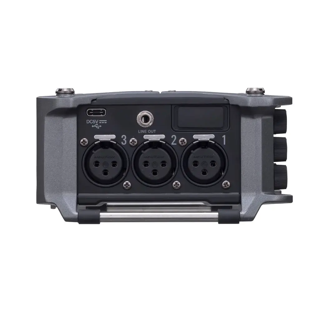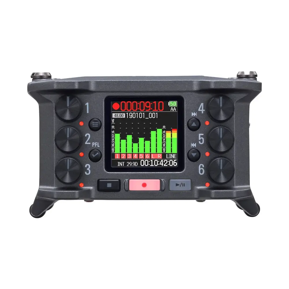 F6 оснащен шестью предусилителями профессионального уровня со сверхнизким шумовым порогом (-127 дБ) и высоким усилением (до 75 дБ). Микрофонный/линейный уровни можно выбирать для любого входа, что идеально подходит для работы на съемочной площадке.