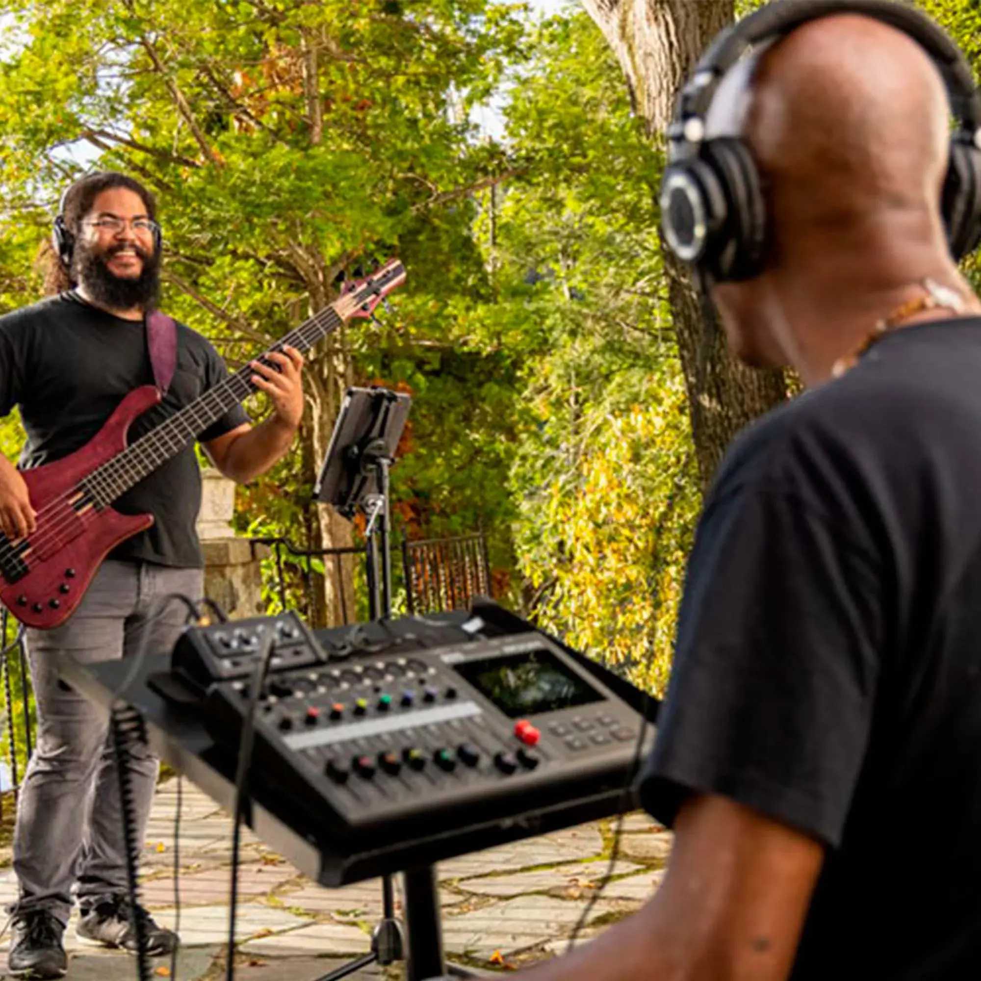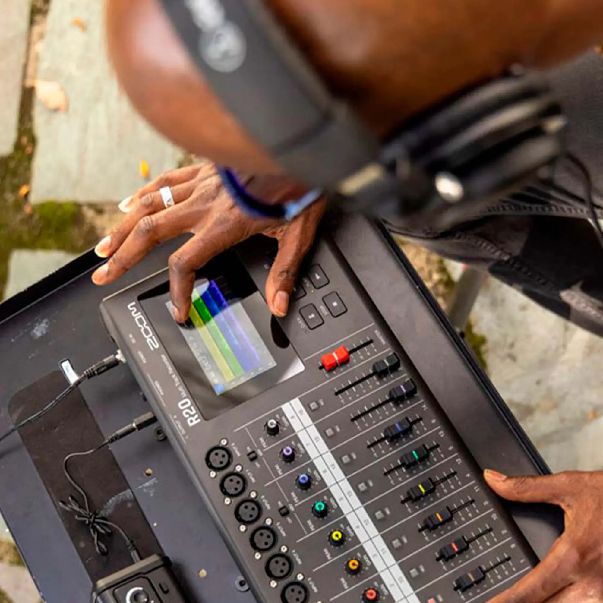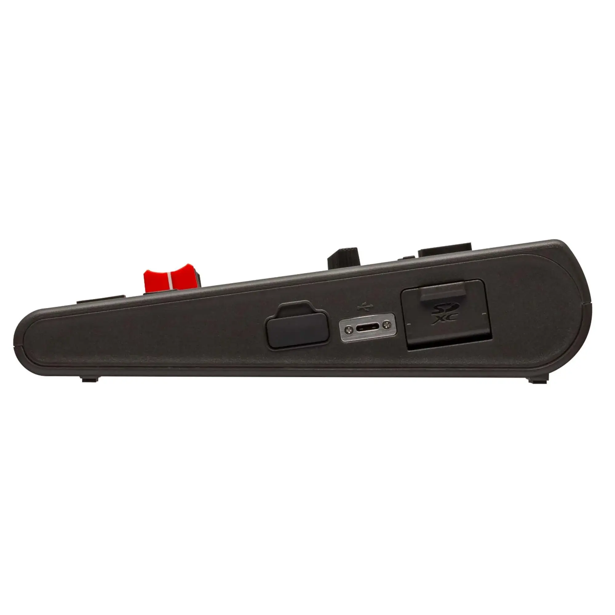 Вывести аудиосигнал на акустическую систему или микшерный пульт можно с помощью 2 балансных выходов на разъемах 1/4'' Jack TRS. Таким же разъемом представлен и выход для наушников. С боковой части корпуса располагается порт USB-C для подключения к ПК, слот для опциональной SD/SDHC/SDXC-карты, на которую ведется запись, а также слот для опционального Bluetooth-адаптера BTA-1. С помощью последнего можно управлять функционалом устройства, используя приложение R20 Control. Энергообеспечение прибора осуществляется от комплектного адаптера на 12 V DC.