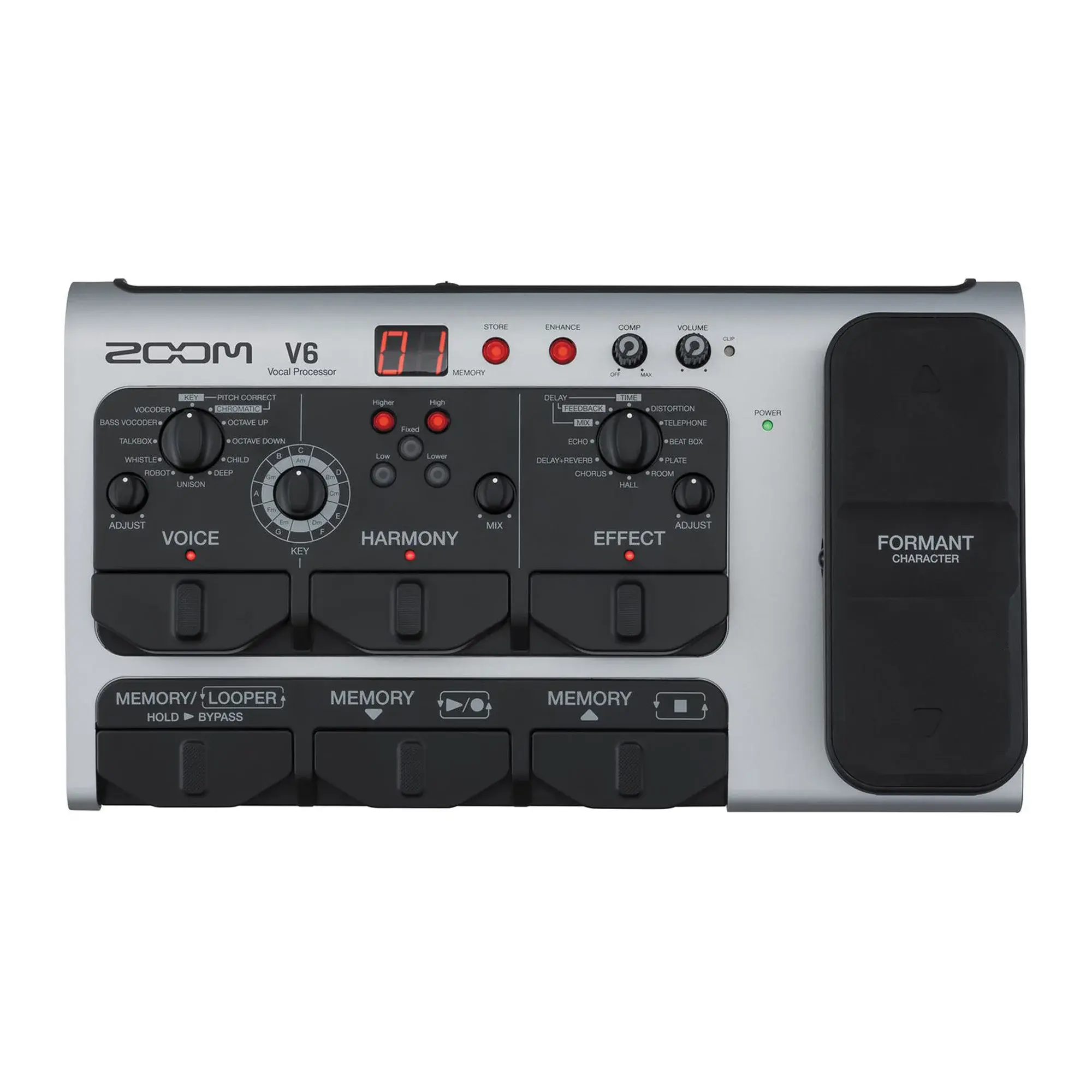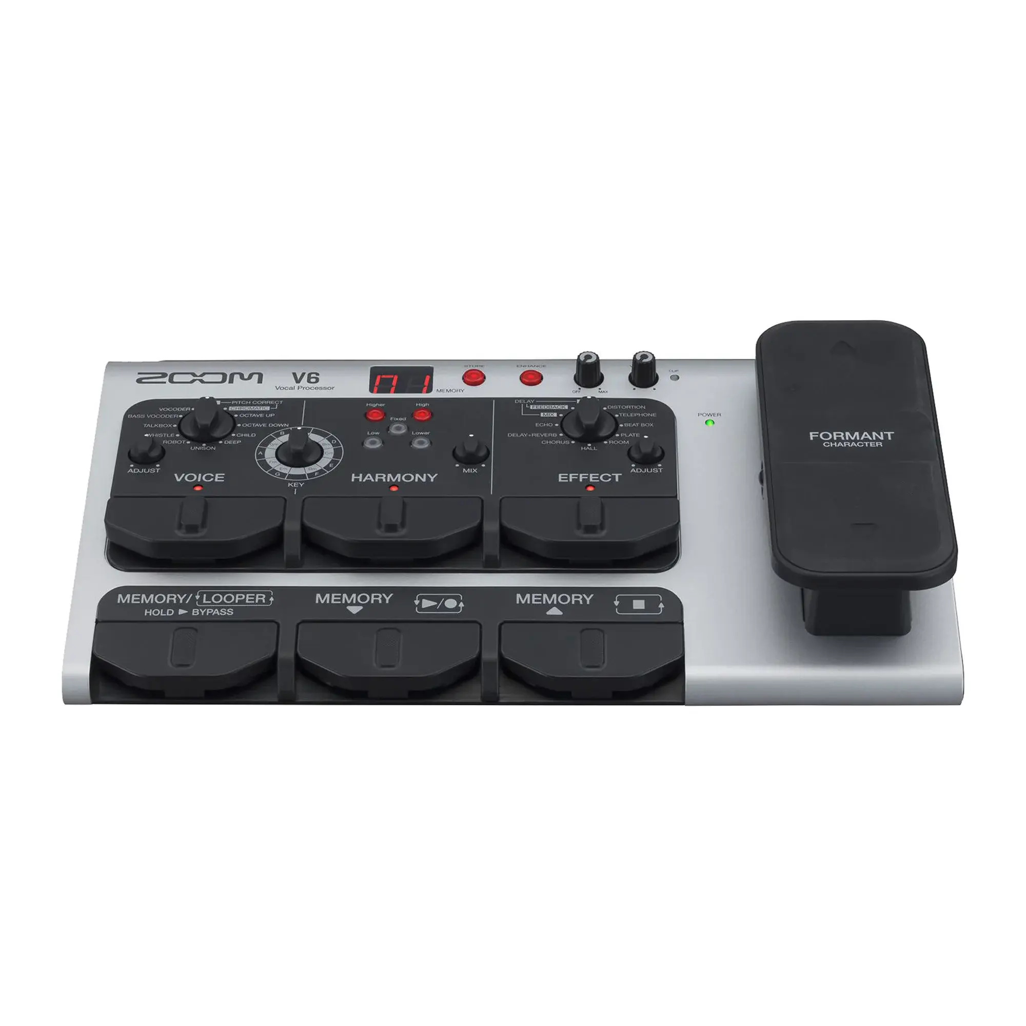 V6-SP – это единственный вокальный процессор, оснащенный педалью экспрессии для управления формантой вашего голоса. Специальная педаль Formant может радикально повлиять на вокальные характеристики, не изменяя при этом высоты голоса, что открывает перед вами беспрецедентно широкий простор для творчества и полета фантазии.